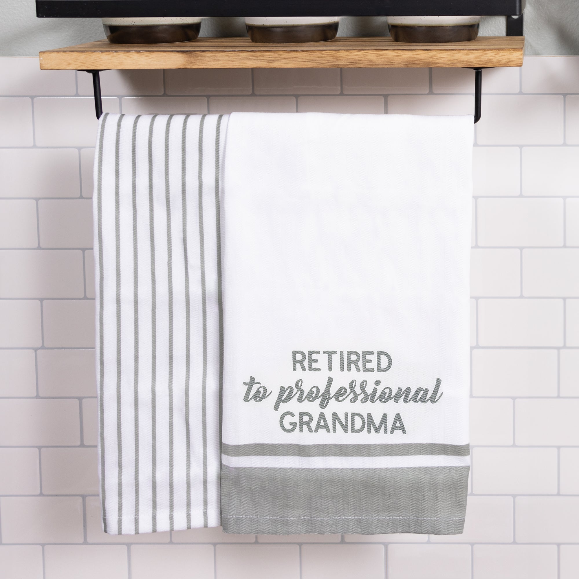 - IN-HOUSE DESIGN: Each towel bears its own design. The one towel has a gray vertical striped pattern. The second towel has a gray bottom with a "Retired To Professional Grandma" sentiment.