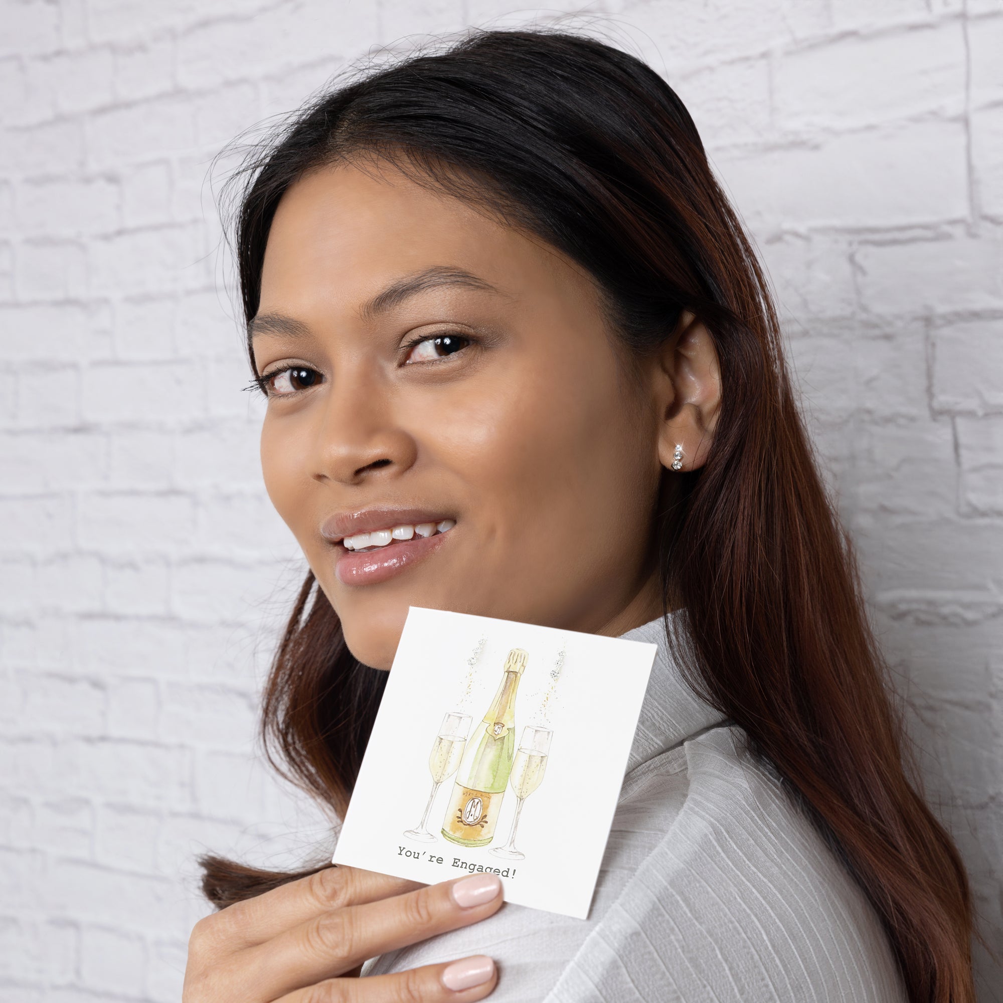 - IN-HOUSE DESIGN: The cheerful, watercolored, clear, and classy champagne-filled flutes cheer and dance around with bubbles accompanied by a bottle of champagne. The typewritten style gray "You're Engaged!" sentiment is placed below the celebratory printed design, whereas the earring is placed in the top center of the card.