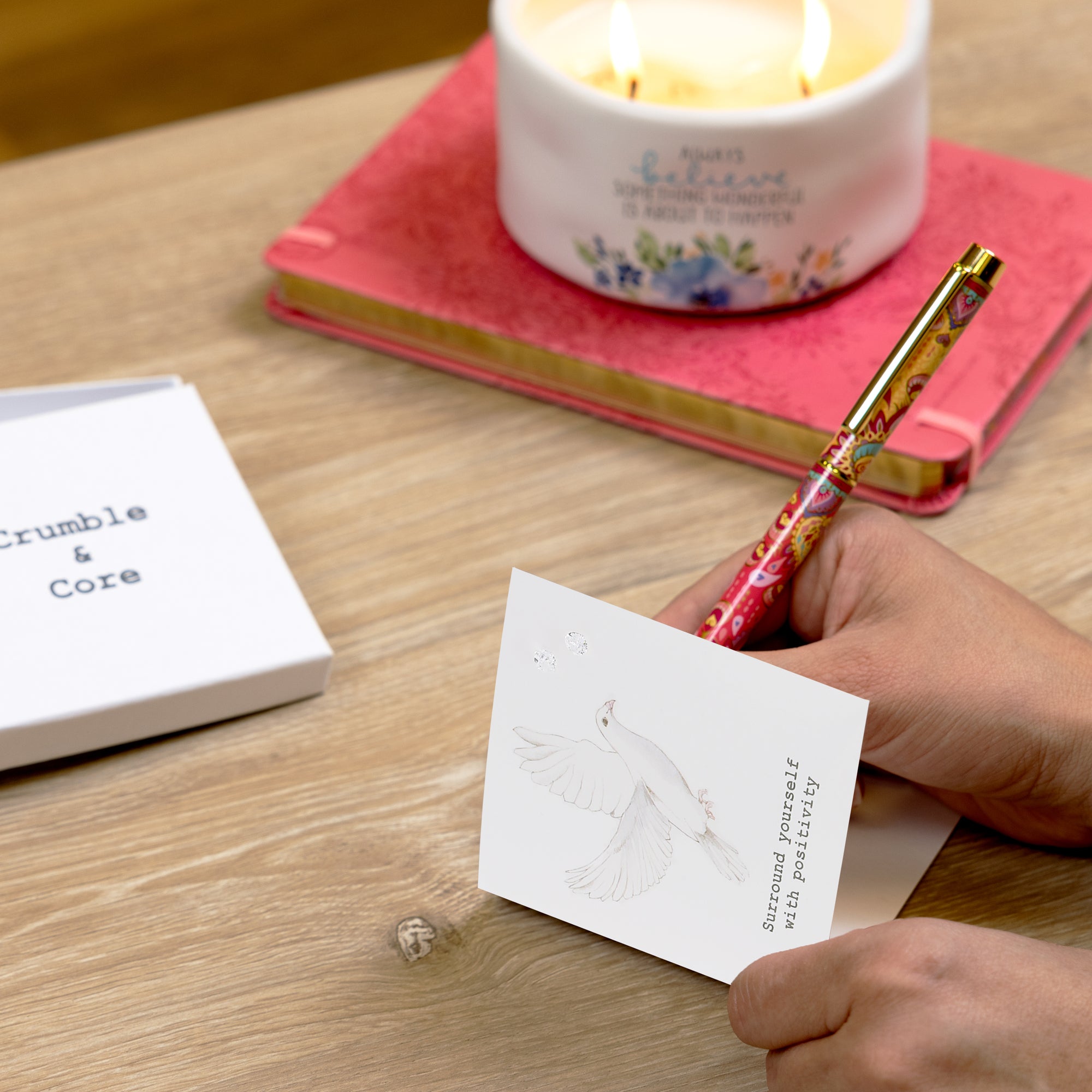 • IN-HOUSE DESIGN: The printed watercolored white dove bird design with the earrings strategically within the wings. The typewritten style gray "Surround Yourself With Positivity" sentiment is placed below the flying bird.