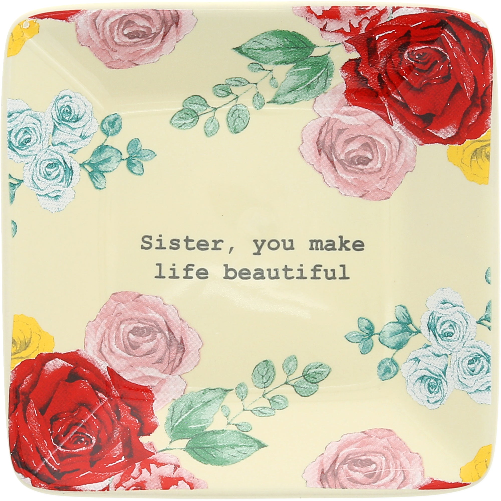 - IN-HOUSE DESIGN: The finish is glossy. The glossy sentiment in the gray "Sister, You Make Life Beautiful" is placed at the dish's center. The background is yellow with red, yellow, pink, blue, and greenery floral patterns.