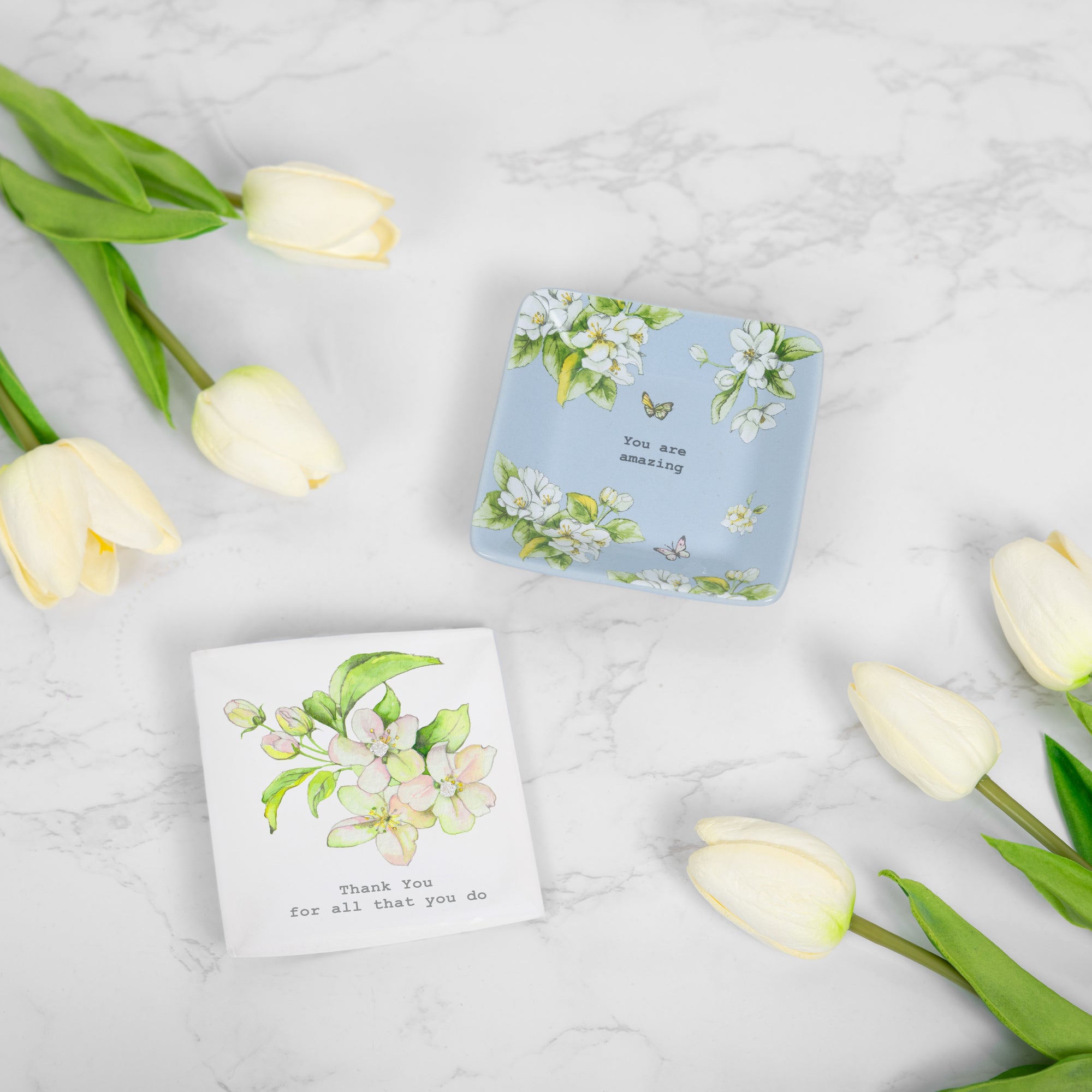 - IN-HOUSE DESIGN: The cheerful, watercolored flowers. The typewritten style gray "Thank You For All That You Do" sentiment is below the celebratory printed design, whereas the earring is placed within the floral centers.