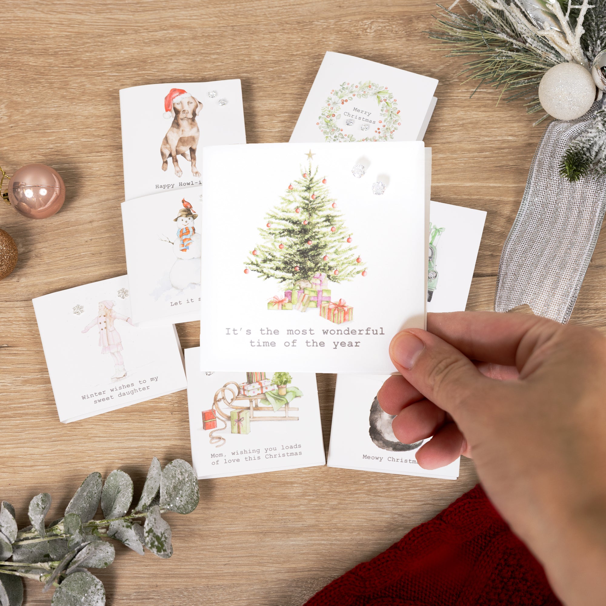 - IN-HOUSE DESIGN: The ornament and star-decorated pine tree holds presents beneath it. The typewritten style gray "It's The Most Wonderful Time Of The Year" sentiment is placed below the celebratory printed design, whereas the earring is placed in the upper right-hand corner of the card.