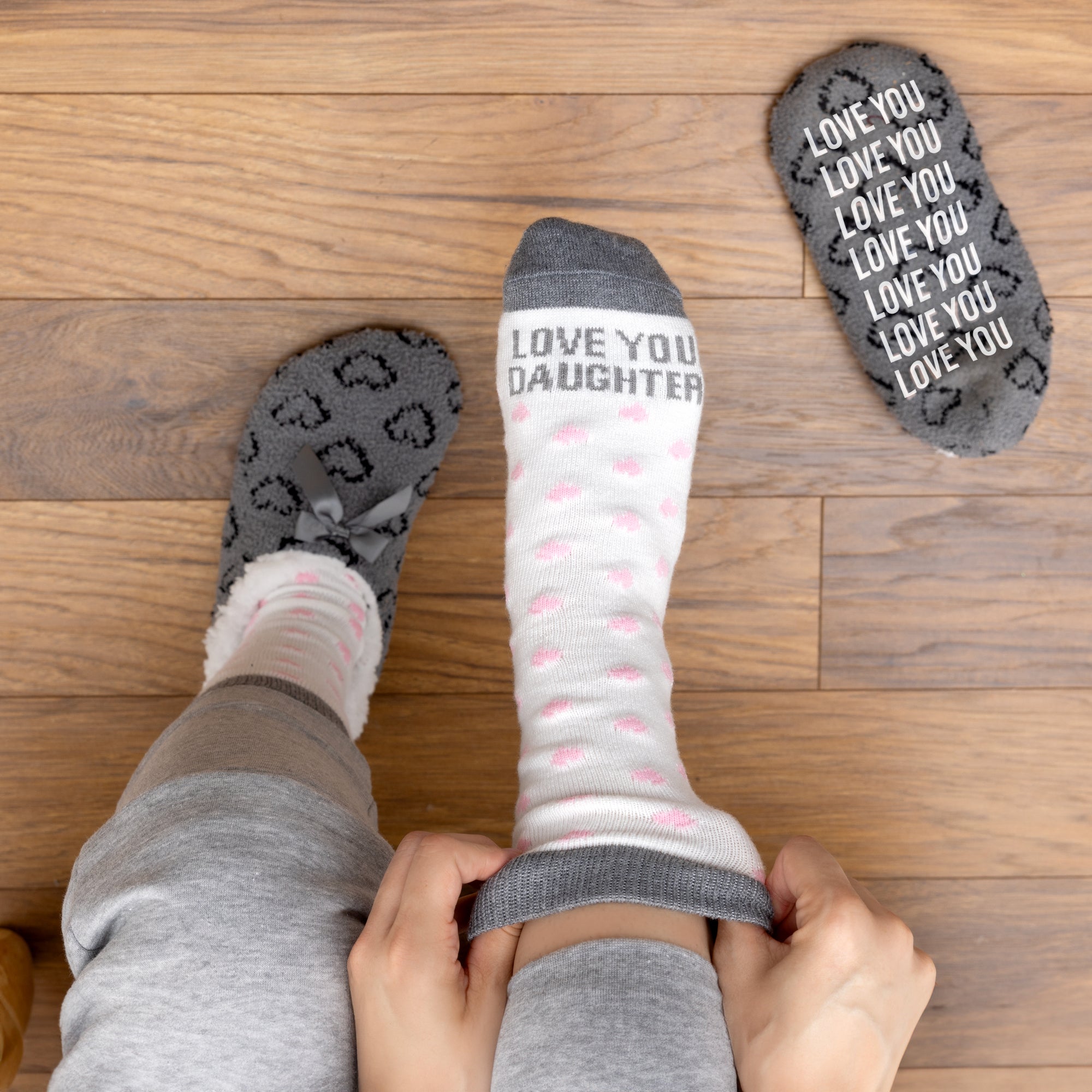 - IN-HOUSE DESIGN: The “Love You Daughter” sentiment is featured on both the socks and slippers, with a pink heart pattern adding a sweet touch. The matching ribbon detail on the slippers enhances the design, making this set a thoughtful and stylish gift. The anti-slip soles of the slippers also display the same heartfelt sentiment, making this set a perfect combination of function and love.
