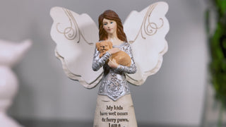 - IN-HOUSE DESIGN: 6" angel figurine holding heart has brown hair and beautifully detailed silver-trimmed and birch wood dress. The foam pads on the bottom to prevent surfaces from being scratched. Scripted text is "My Kids Have Wet Noses & Furry Paws; I Am A Proud Dog Mom" text is debossed and painted onto the front of the angel, alongside an intricate silver design and dog.