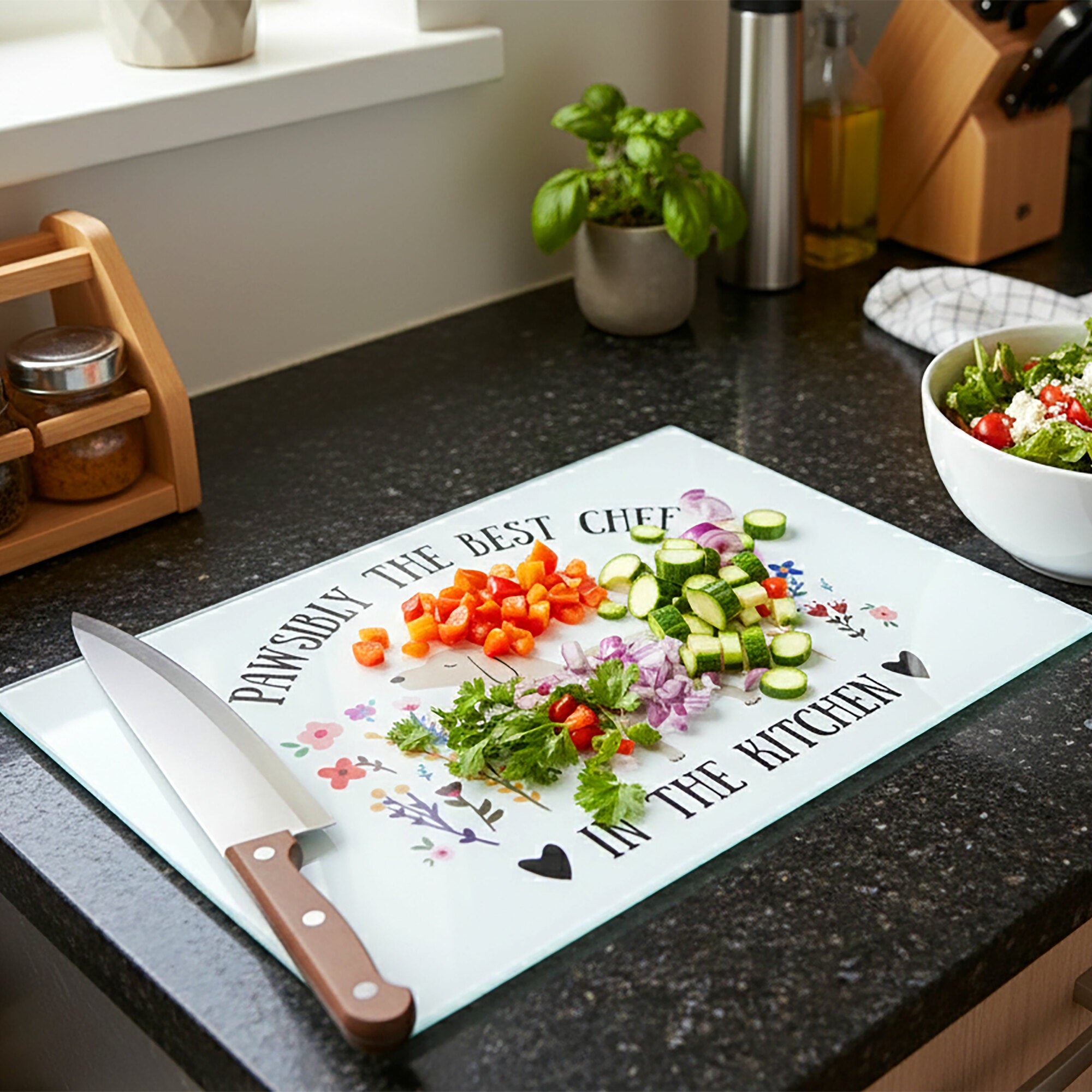 - IN-HOUSE DESIGN: Showcases a light brown dog decorated with floral accents, standing proudly in a whimsical garden setting. The phrase “Pawsibly the Best Chef in the Kitchen” is printed in bold, playful lettering above and below the illustration. A sweet and pun-filled nod to dog lovers who rule the kitchen.