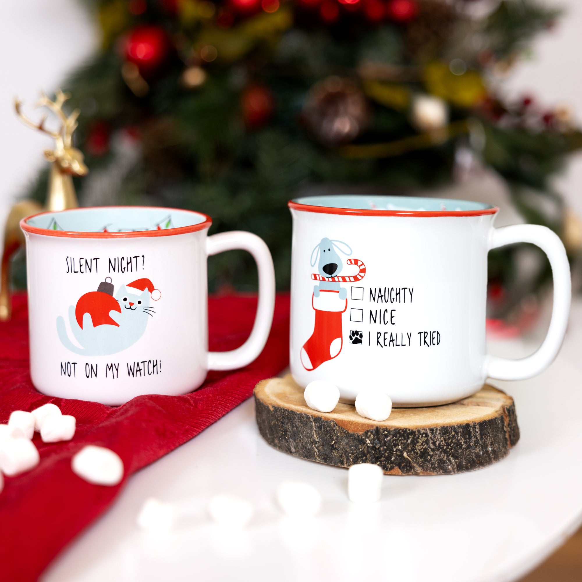- IN-HOUSE DESIGN: The front of the mug features an adorable illustration of a dog holding a candy cane, hanging over a stocking. The playful checklist on the side humorously captures the holiday sentiment: "Naughty, Nice, I really tried. Inside, the rim is lined with a candy cane pattern, adding a festive surprise when drinking from the mug.