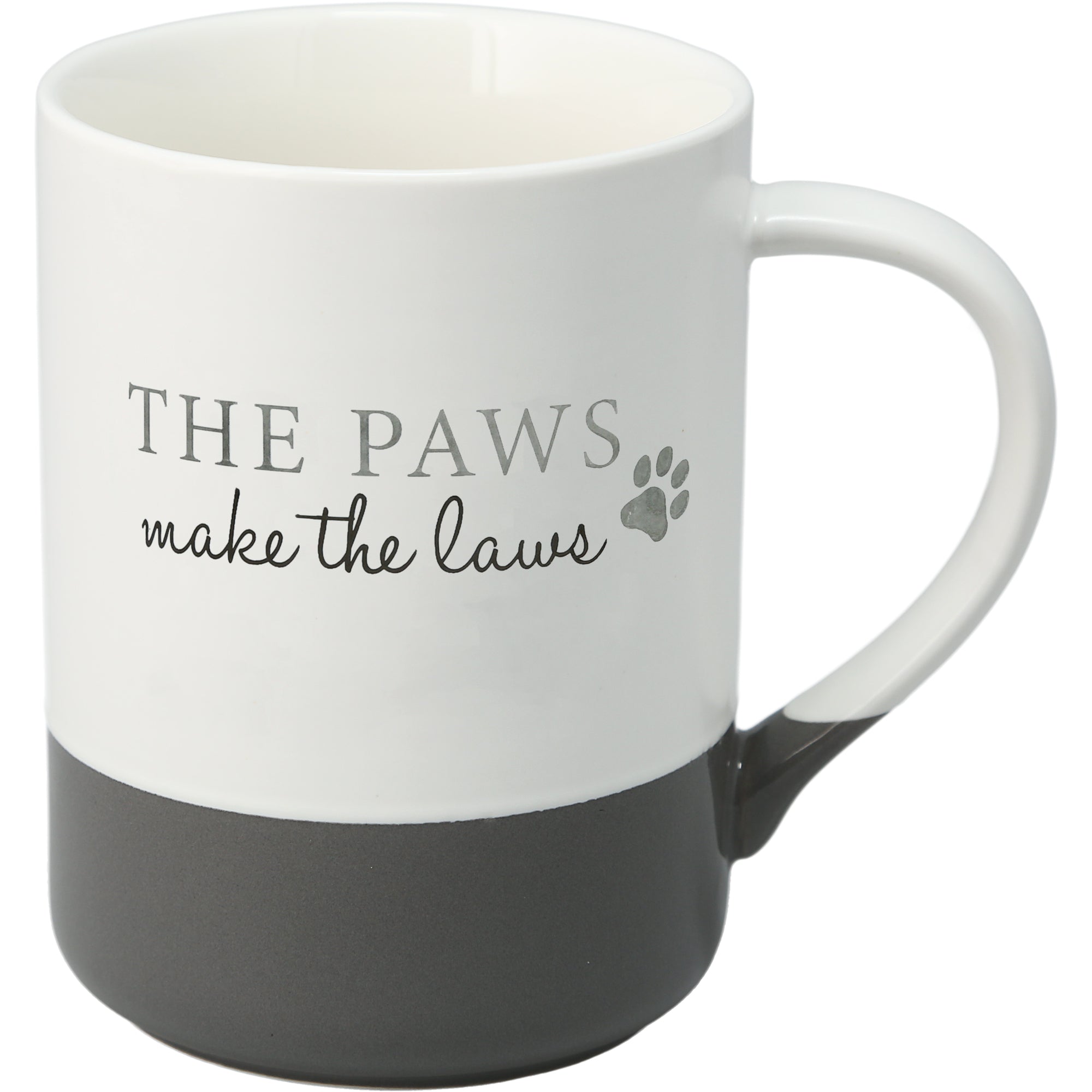 - IN-HOUSE DESIGN: Displays the phrase “The paws make the laws” in glossy decal with a charming paw print accent. The clean, neutral color palette adds a touch of sophistication to your pet-themed mug collection.