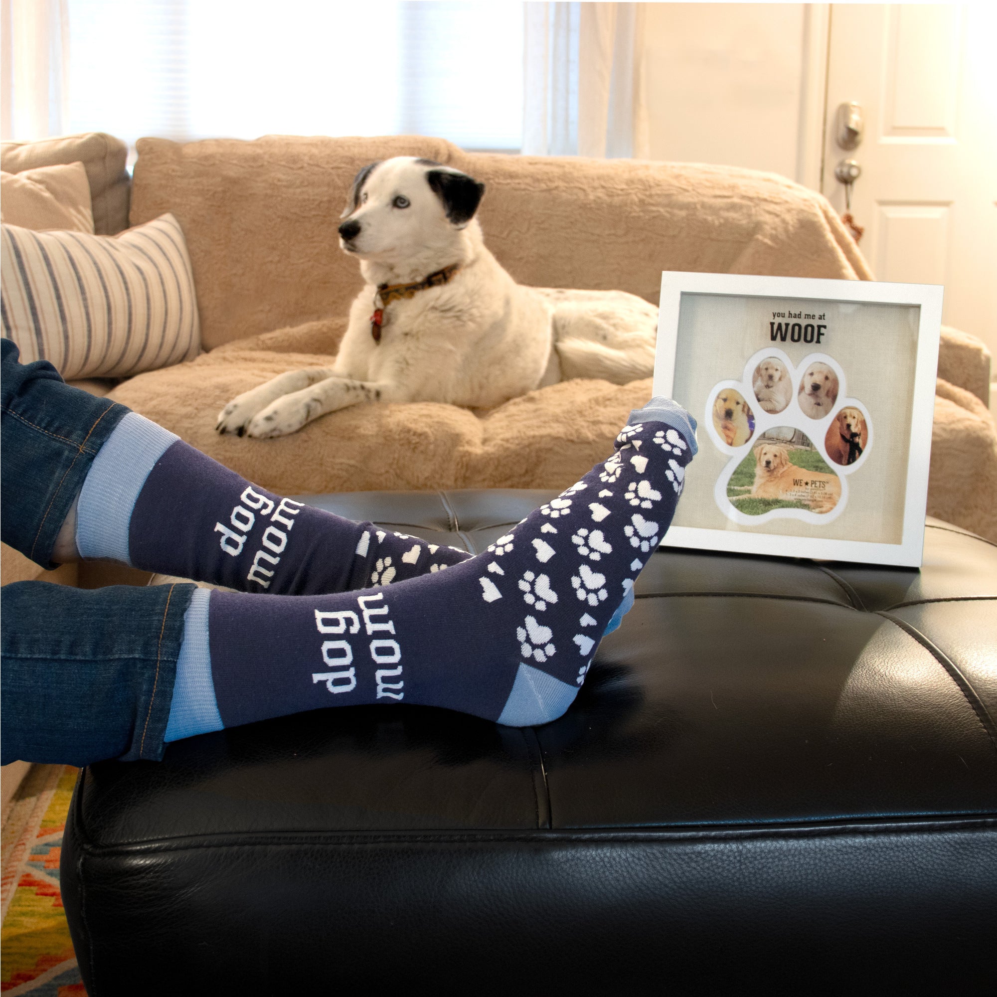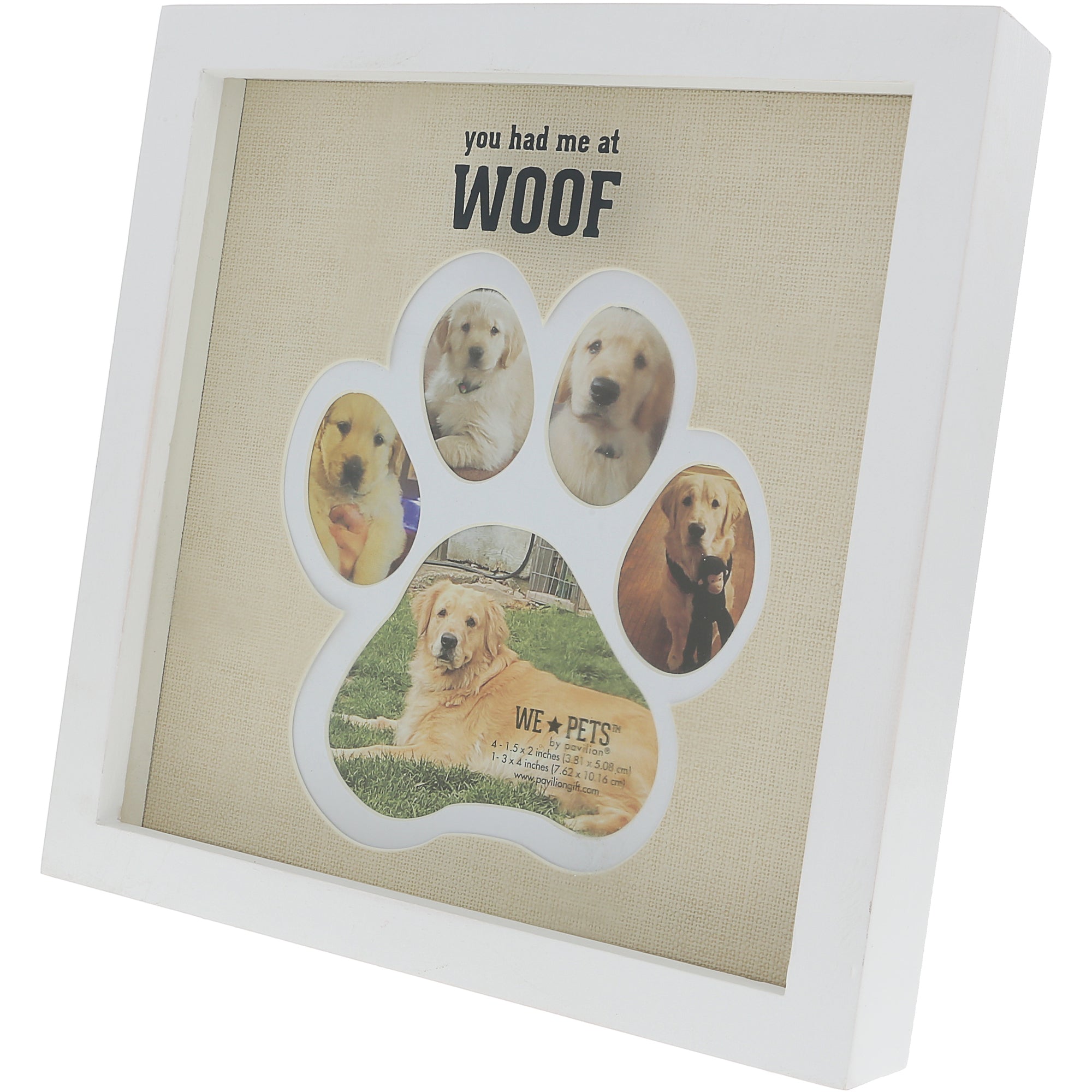 • IN-HOUSE DESIGN: The glass front has the dark gray sentiment, "You Had Me At Woof." The textured tan mat board is layered on the white mat board. The backing is made from a thick cardboard-like material, with a metal hinged easel and triangle hanger for displaying and two metal tabs for photo replacement.