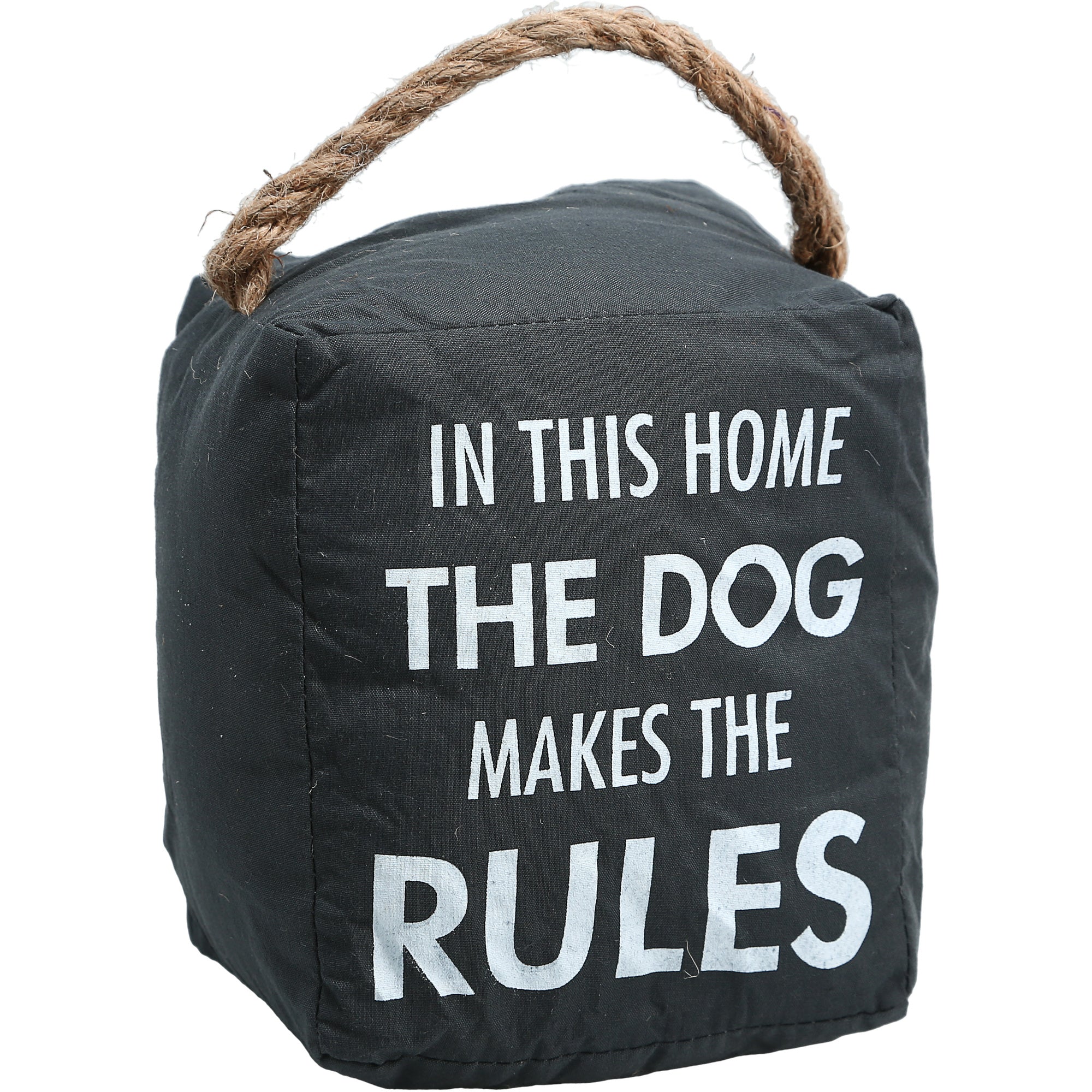- IN-HOUSE DESIGN: The overall gray stopper has a white screen printed "In This Home The Dog Makes The Rules" sentiment on the front side of the bean bag. Also, utilize these as bookends, even put behind a door to prevent the handle from damaging the walls or in front to keep the door propped open.