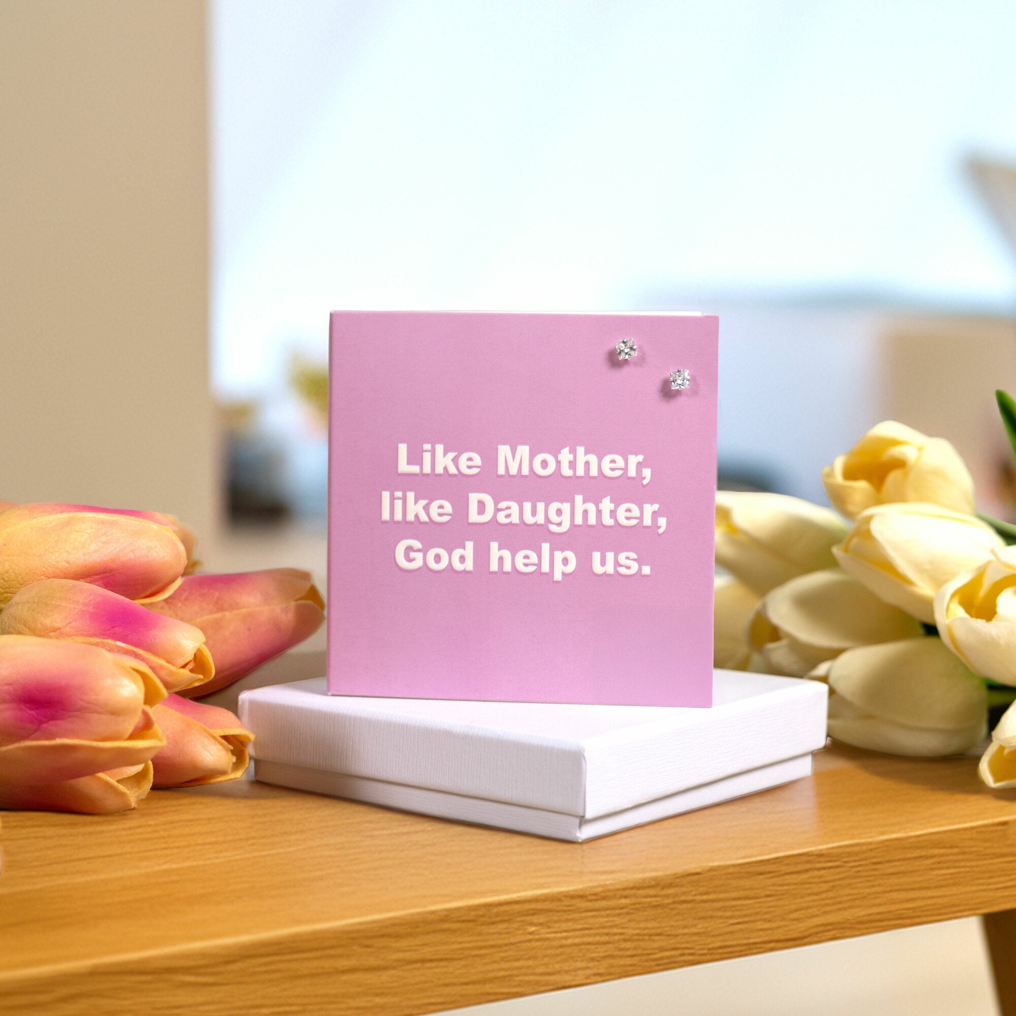 - IN-HOUSE DESIGN: Printed on a folded pink card, the message reads: “Like mother, like daughter, God help us.” Embossed glossy text adds a premium touch to this cheeky and heartfelt design—perfect for sassy moms and daughters.