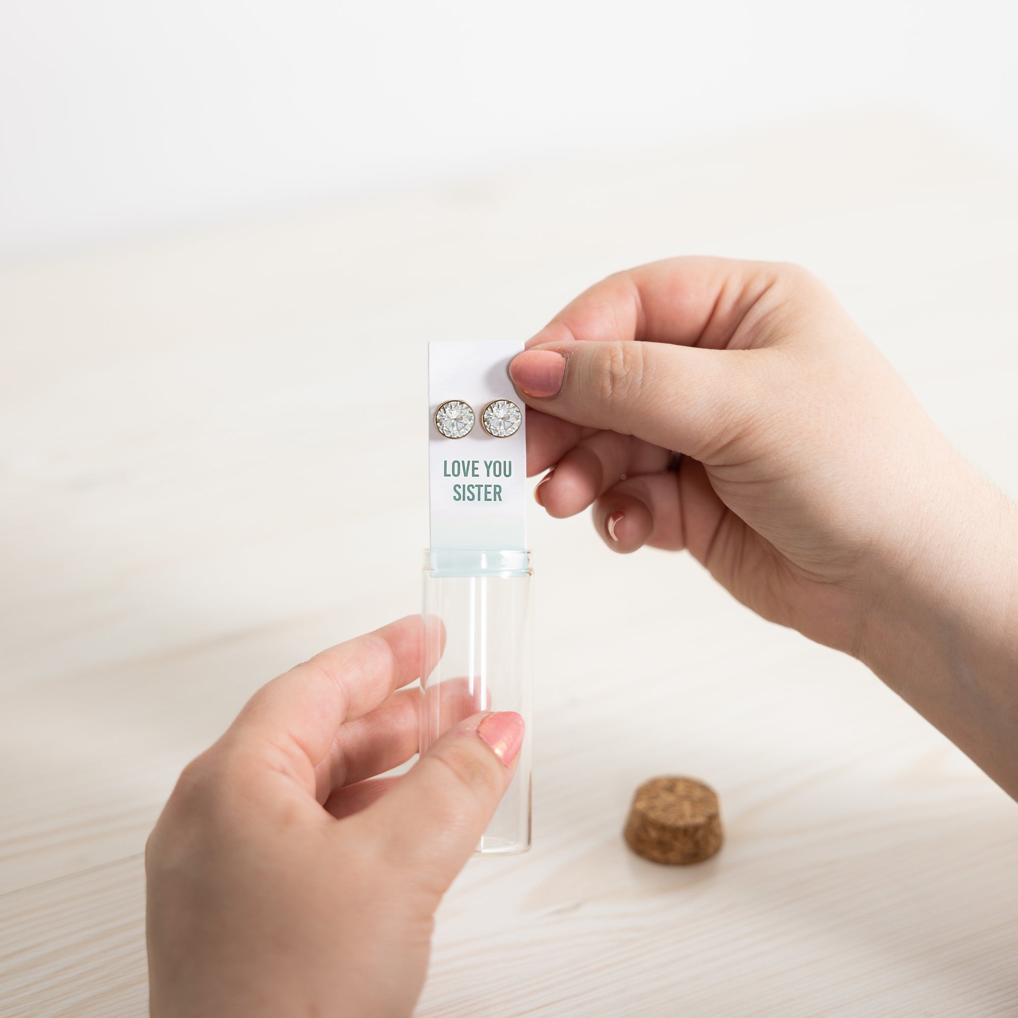 - PREMIUMQUALITY: The 8mm stud bezel earrings are 14k gold plated with a stainless steel structure; the gems are cubic zirconia with push-backs. The cute 1.25" x 3.25" bottle is constructed of glass with a cork lid closure - a wonderful place to hold your earrings while not wearing them for safe keeping on the go. Along with a to:/from: craft tag that's wrapped with a gold string around the cork.