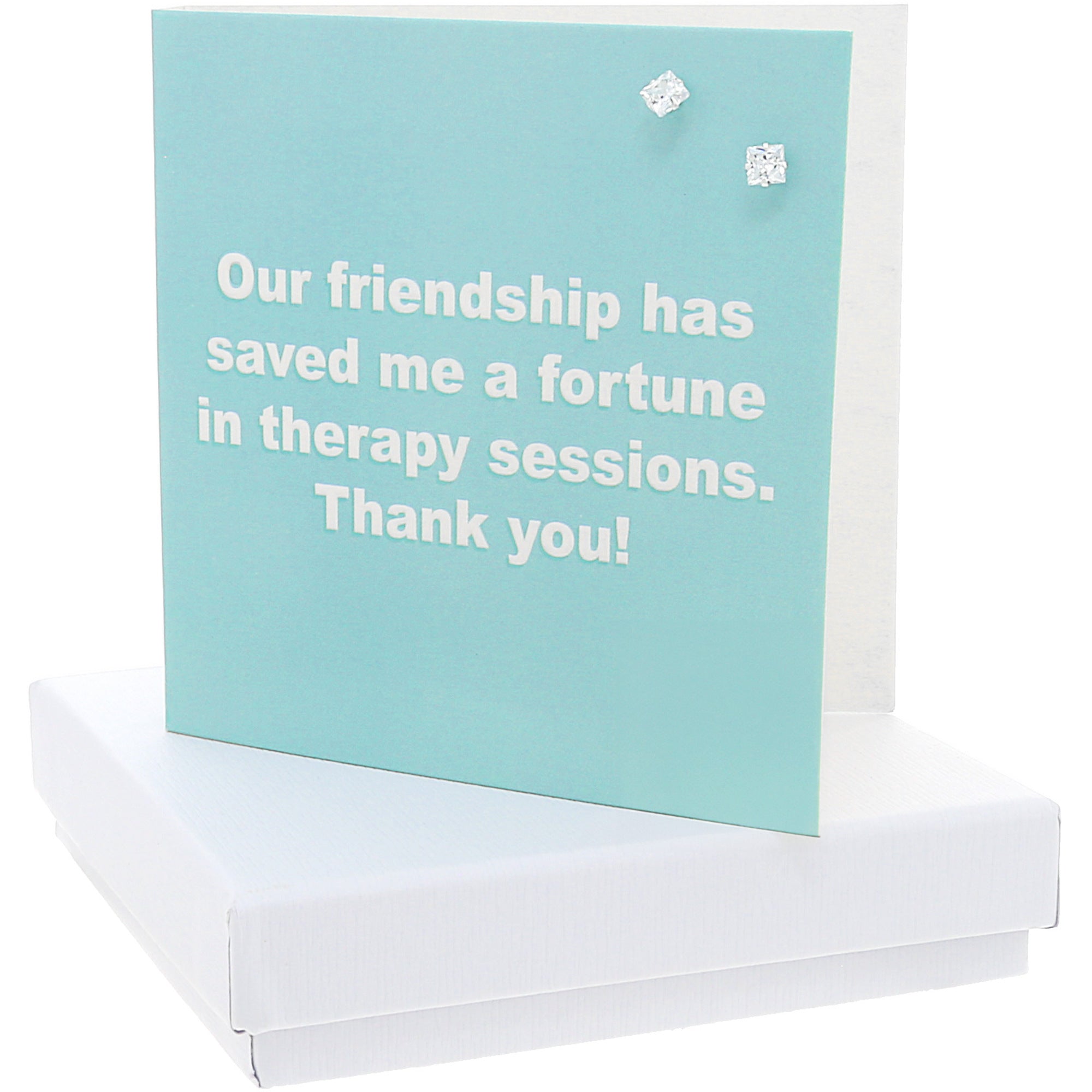 - IN-HOUSE DESIGN: Printed on a calm light blue folded card, the embossed white message reads: “Our friendship has saved me a fortune in therapy sessions. Thank you!” This clever and affectionate sentiment hits home for friendships that have been through it all.