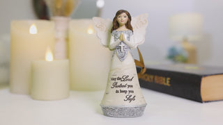 - IN-HOUSE DESIGN: 4.5" angel figurine holding cross has brown hair and beautifully detailed silver-trimmed and birch wood dress. The foam pads on the bottom to prevent surfaces from being scratched. Scripted text is "May the Lord protect you and keep you safe."