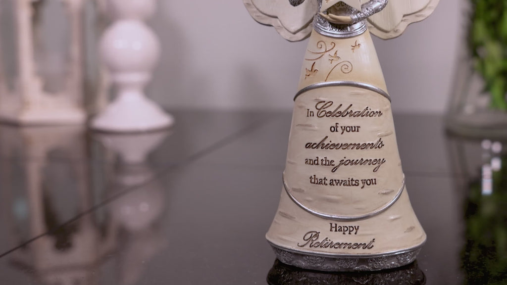 - IN-HOUSE DESIGN: "In Celebration Of Your Achievements And The Journey That Awaits You; Happy Retirement" text is debossed and painted onto the front of the angel, alongside an intricate silver design and star.