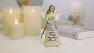 • IN-HOUSE DESIGN: This beautiful brown haired angel is holding a colorful bouquet of blue, coral and red accented flowers."Chance Made Us Sisters; Hearts Made Us Friends" text is debossed and painted onto the front of the angel, alongside an intricate silver design and flowers.