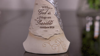 - IN-HOUSE DESIGN: "With God All Things Are Possible; Matthew 19:26" text is debossed and painted onto the front of the angel, alongside an intricate silver design and cross.