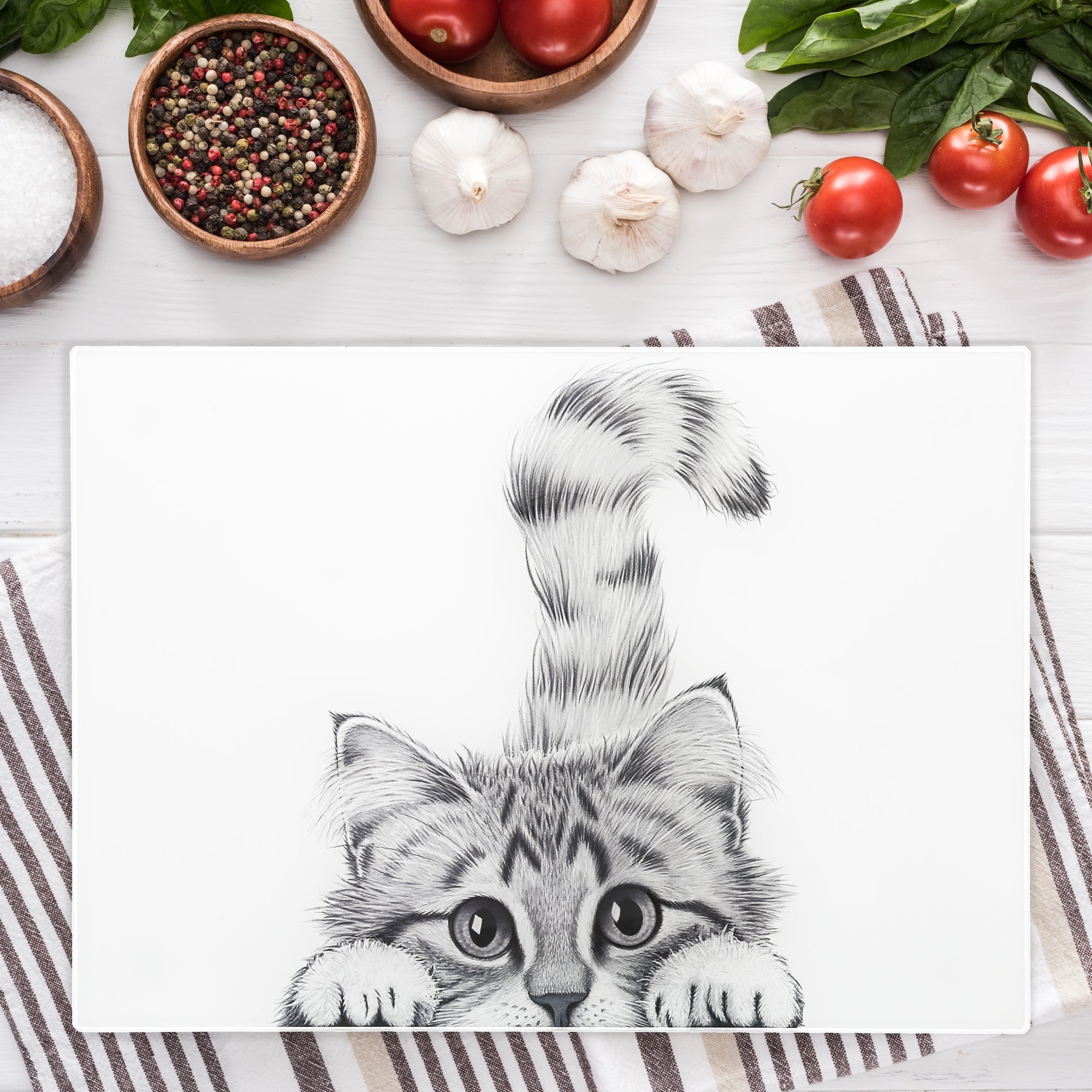 • IN-HOUSE DESIGN: A delightful black-and-white illustration of an inquisitive cat graces the front of this cutting board, adding a whimsical charm that is sure to brighten your cooking experience. The clean, modern design makes it a versatile piece for any kitchen aesthetic.