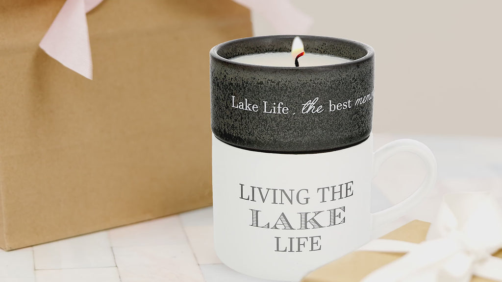 - IN-HOUSE DESIGN: Wrap-around white sentiment on the candle, "Lake Life, The Best Memories Are Made At The Lake." Gray mug sentiment "Living The Lake Life" on the front side of the mug only. Faces towards you in the right hand or outward in the left hand.