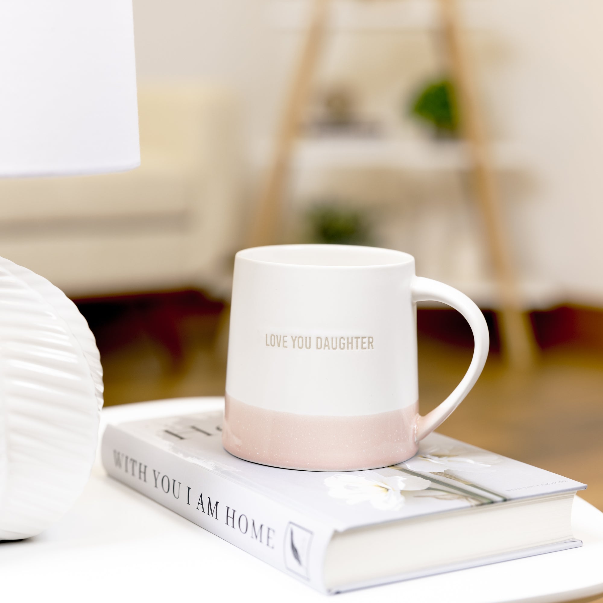 - IN-HOUSE DESIGN: The hand-dipped 1/3 pink-colored bottom is unique to each piece. The tan debossed "Love You Daughter" sentiment is stamped in the middle center of the white upper half of the front side of the cup. This simplistic, modern-styled mug is the perfect addition to any drinkware collection.