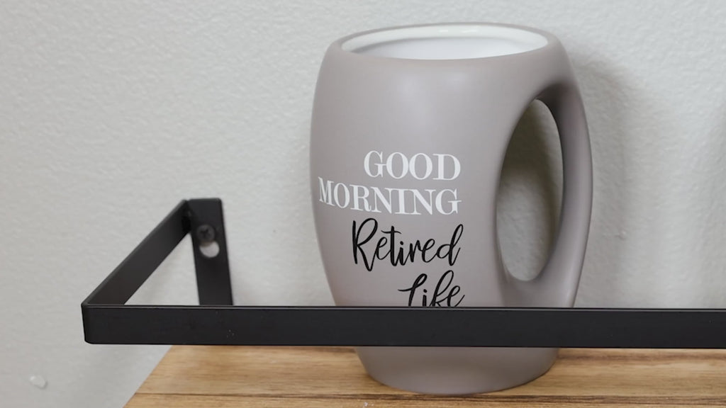 - IN-HOUSE DESIGN: "Good Morning Retired Life" text is printed on the front of the mug.