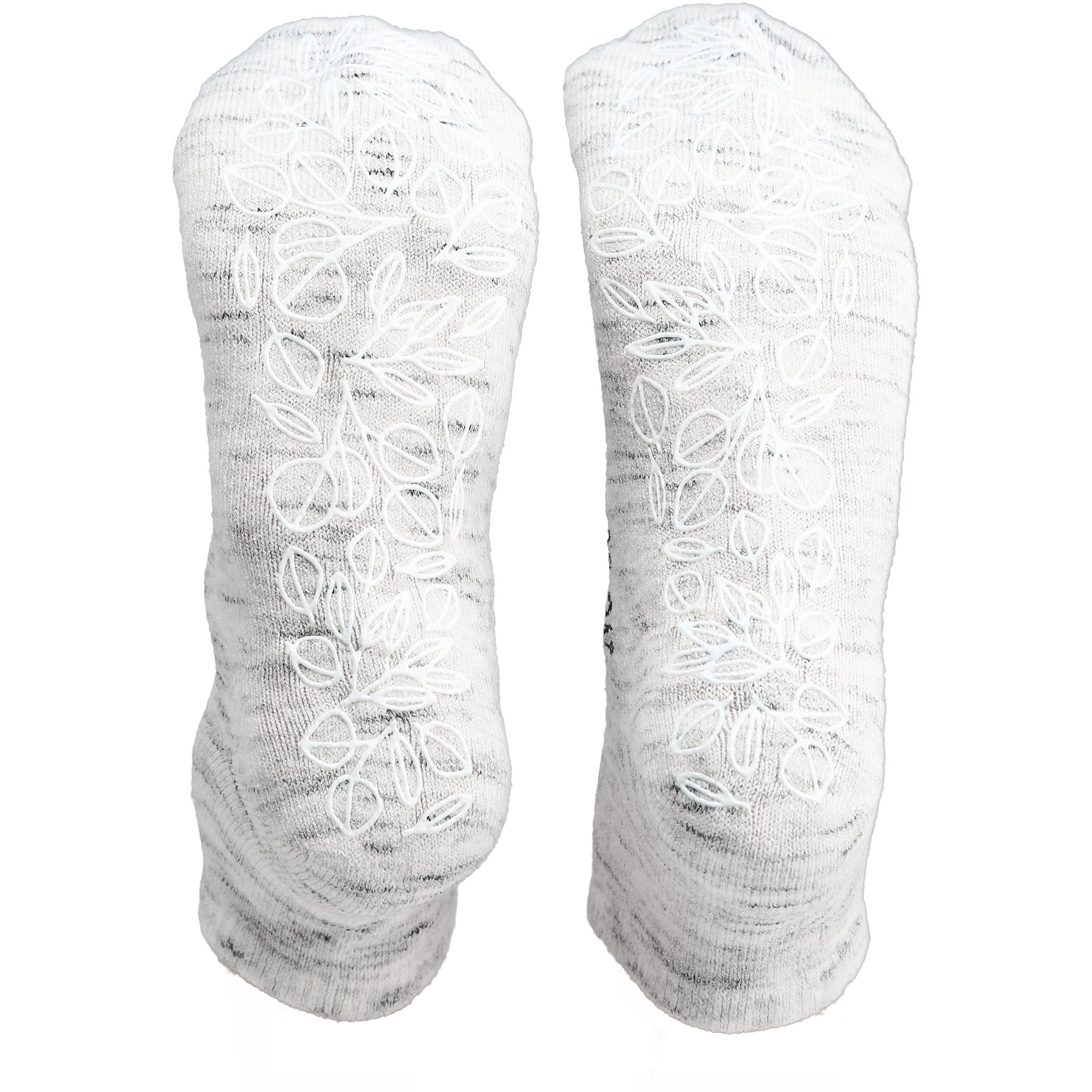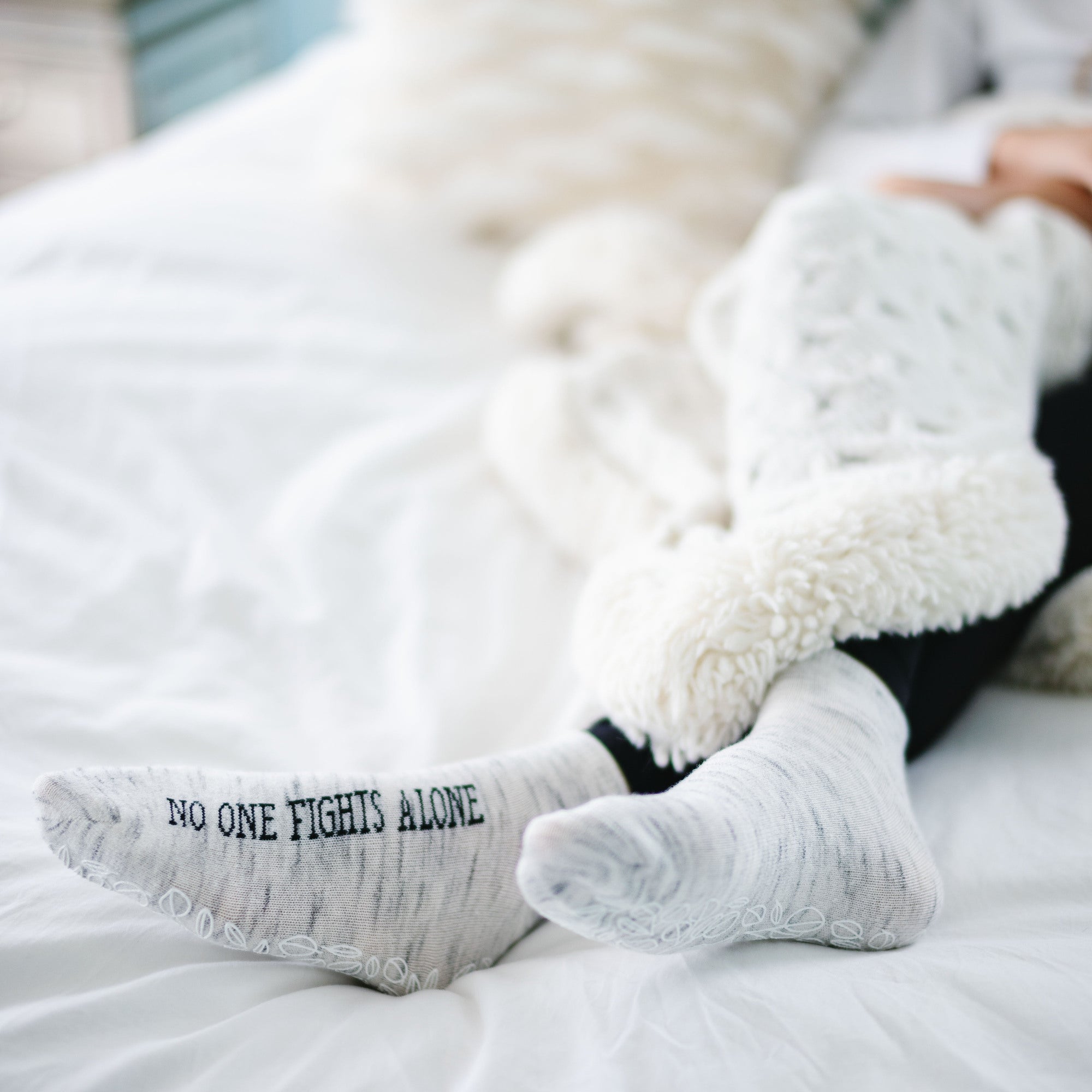 • IN-HOUSE DESIGN: Pastel-colored gray ankle socks with a blended white/color design. The sentiment "No One Fights Alone" is printed on the side of the foot in black printed on text. Bottoms of socks have a non-slip super cute floral patterned bottom that prevents you from slipping.