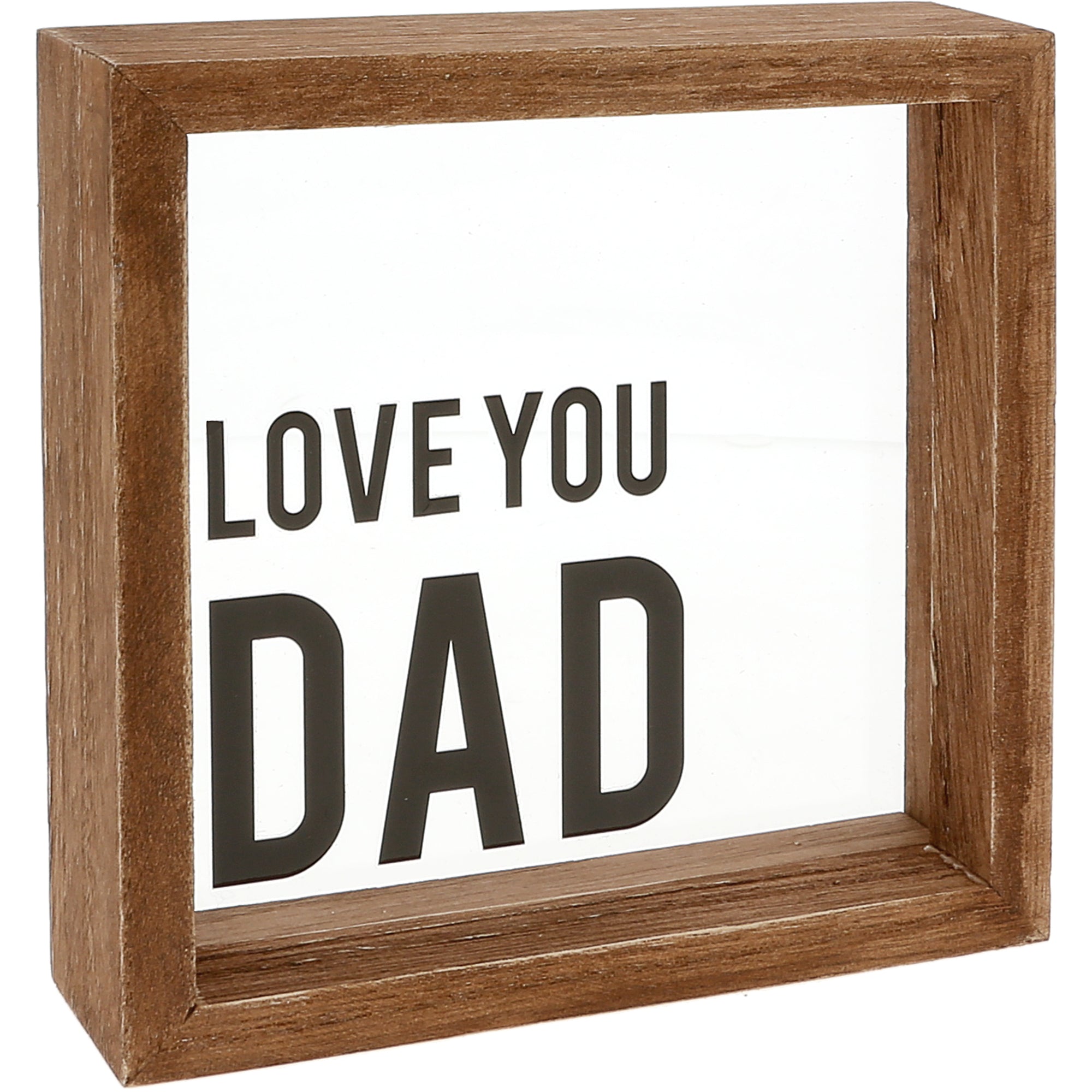 - PREMIUM QUALITY: This 5" x 5" plaque features a dark wood-stained frame and a clear glass panel with the simple and heartfelt phrase “Love You Dad.” Comes with a metal sawtooth hanger and can also stand on its own.