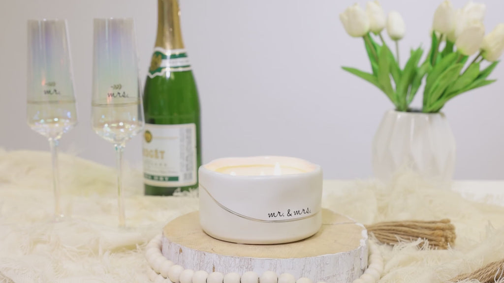 - IN-HOUSE DESIGN: The new & innovative candle offers a unique message for your loved one within the wax as time progresses. You will see cursive written "Together Is Better" sentiment after about 10 minutes. As you watch, the entire decal with an intertwining golden triple-string and leaf design will appear after 60 minutes. Then, the message will hide again and reappear with each burn. The front of the candles has a simplistic "Mr. & Mrs." decal accompanied by iridescent gray and metallic gold striped wrap-around patterns on a matte white exterior handmade feel vessel with a glossy interior.