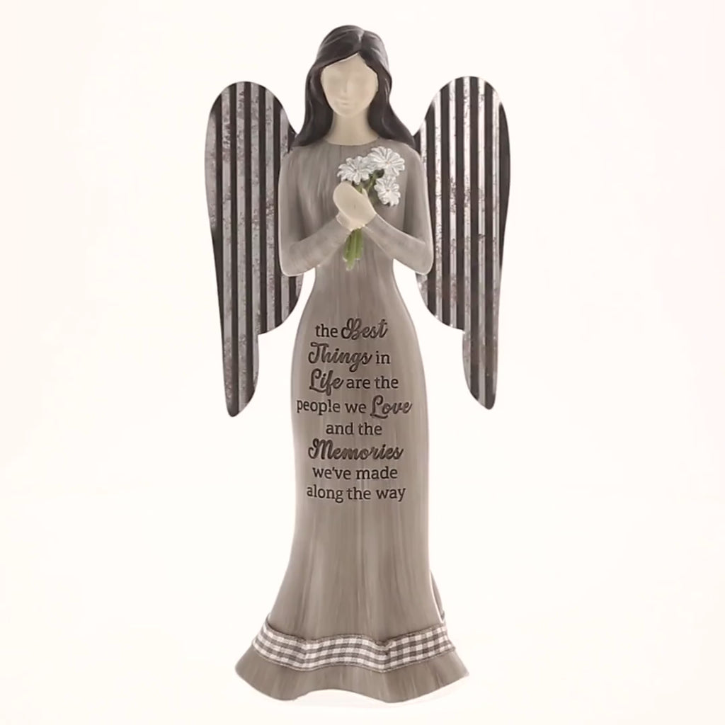 - PREMIUM QUALITY: Beautiful hand-painted 9" tall, 3" wide, and 4.25" long brunette hand-crafted resin angel figurine is holding white daisy flowers, wearing a long-sleeve brown dress accompanied by a real checkered plaid ribbon trim around the bottom that's tied as a bow in the back with real metal/tin wings attached to the center of her back. Comes packaged in protective foam inside of a logo-stamped die-cut box.