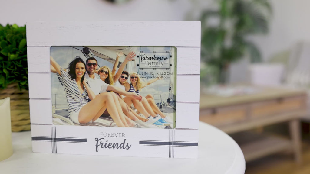 - IN-HOUSE DESIGN: Neutral modern farmhouse weathered white wood-washed shiplap look sturdy wood veneer and MDF construct with glass front. "Forever Friends" gray decal sentiment accompanied by a gingham, plaid, checkered pattern. The backing has four metal tabs for photo replacement. Self-standing or can be hung by the edge.