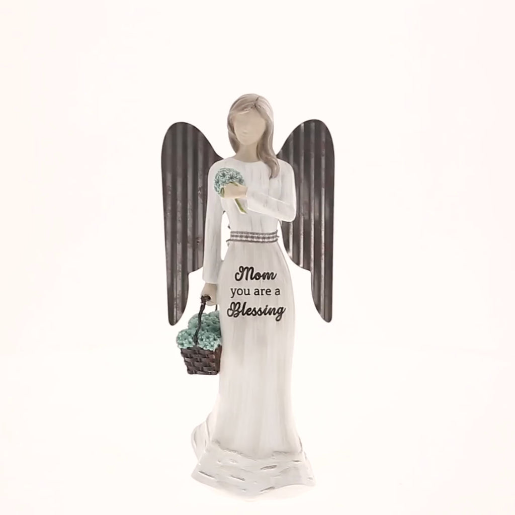 • PREMIUM QUALITY: Beautiful hand-painted 7.5" tall, 3.25" long, and 2.5" wide blonde hand-crafted resin angel has a basket full of hydrangea flowers in her right hand and one stem in the left. She is wearing a long-sleeve off-white dress with birch wood detailing at the bottom, accompanied by a real checker plaid ribbon trim around the waist with a bow in the back with real metal/tin wings attached to the center of her back. Packaged in protective foam inside of a logo-stamped die-cut box.