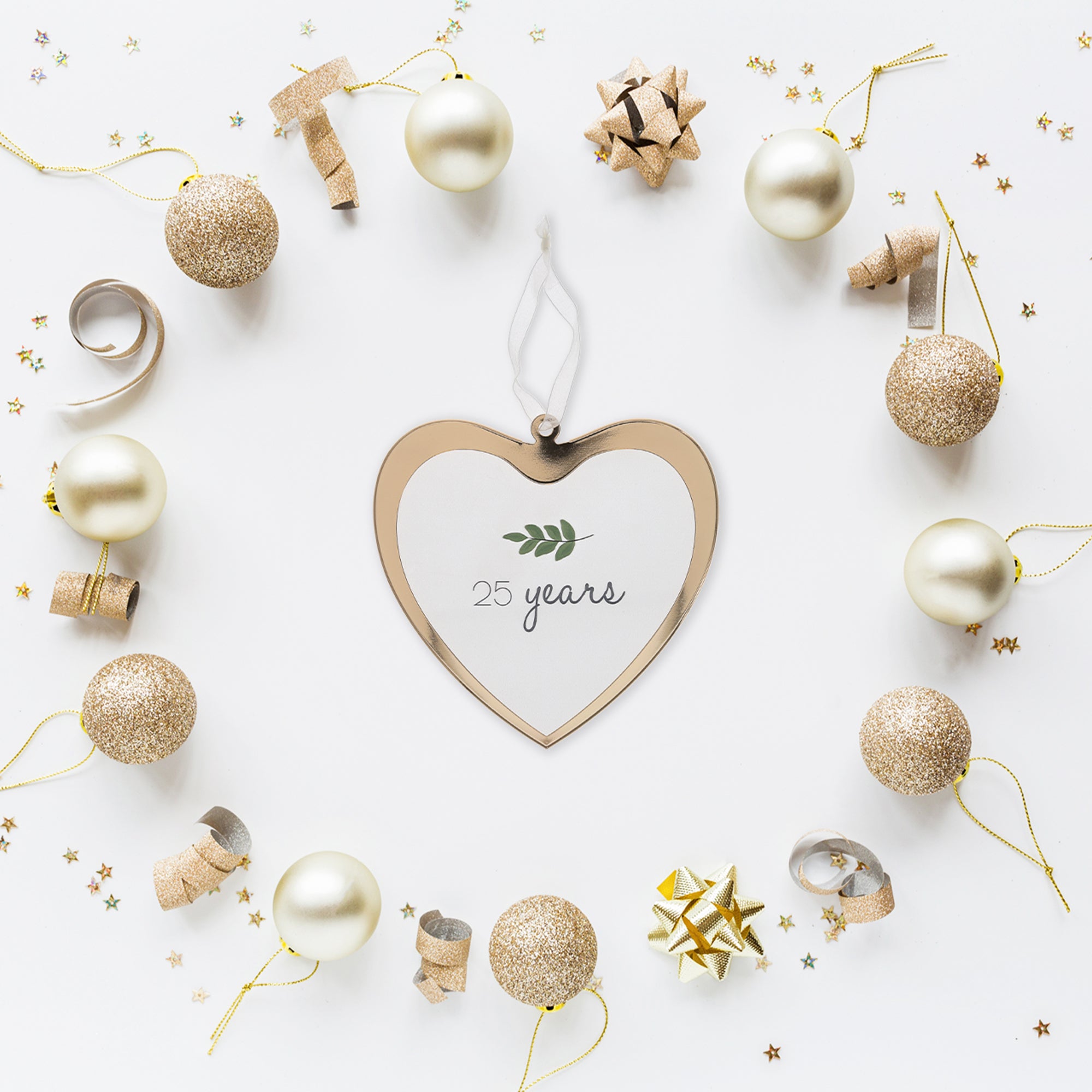 - IN-HOUSE DESIGN: Some greenery leaves are accompanied by the heartfelt wedding anniversary sentiment "25 Years" elegantly placed onto the centerpiece of the ornament.