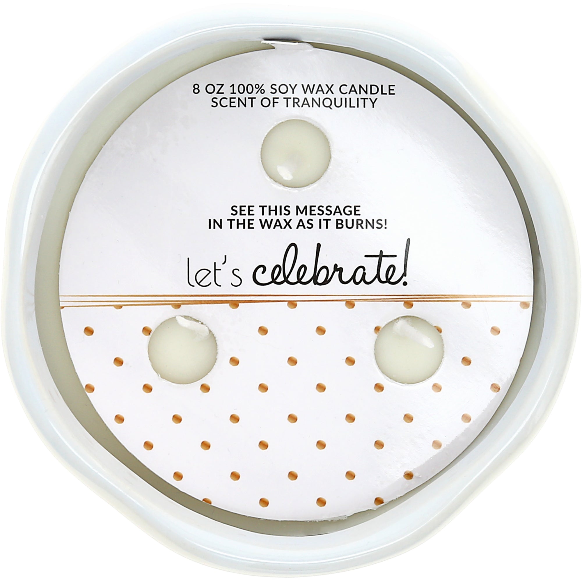 - IN-HOUSE DESIGN: The new & innovative candle offers a unique message for your loved one within the wax as time progresses. You will see cursive written "Let's Celebrate" sentiment after about 10 minutes. As you watch, the entire decal with an intertwining golden triple-string and polka dot design will appear after 60 minutes. Then, the message will hide again and reappear with each burn. The front of the candles has a simplistic "25 Years" decal accompanied by two leaves and a metallic gold triple intertwining circle on a matte white exterior handmade feel vessel with a glossy interior.