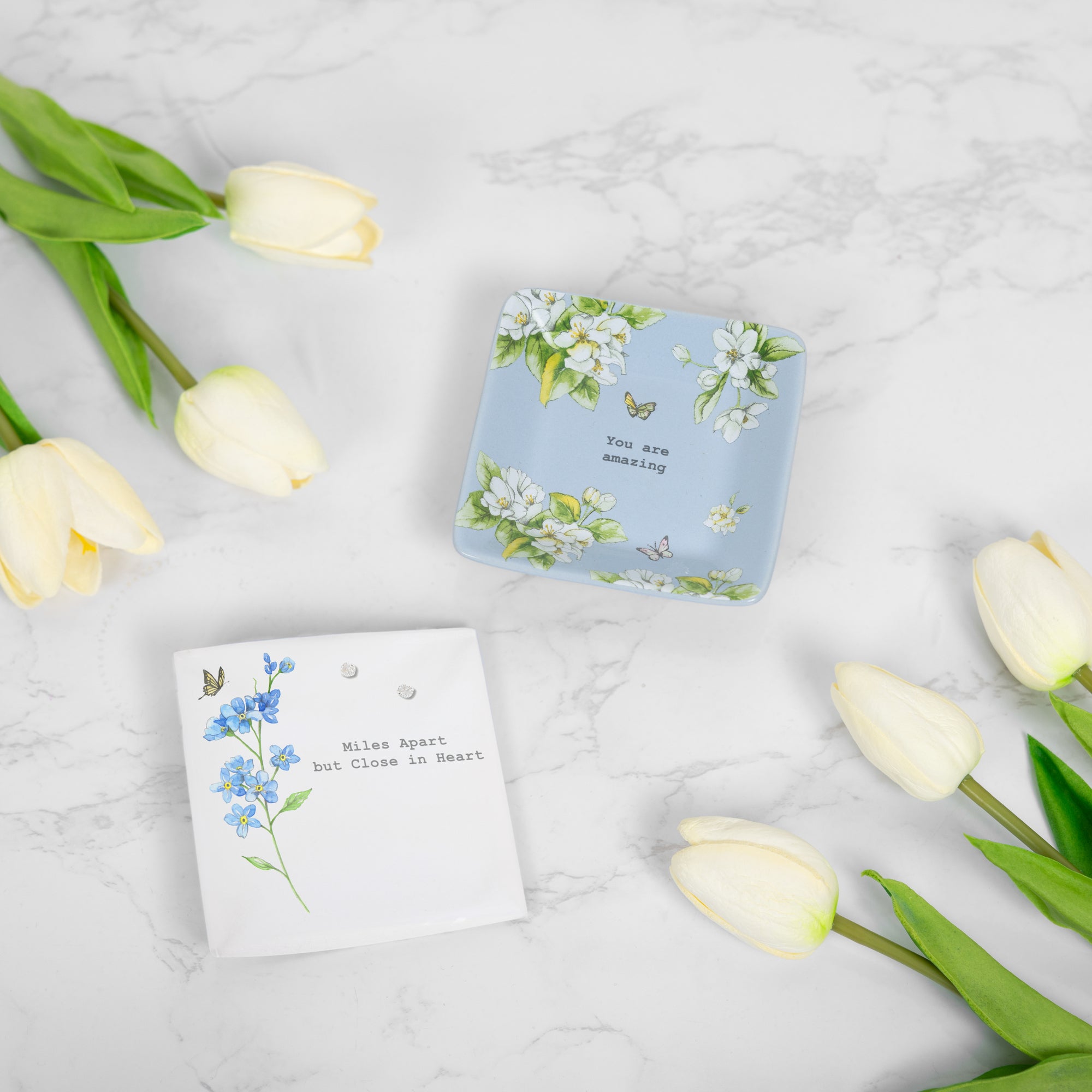 - IN-HOUSE DESIGN: The cheerful, watercolored Forget Me Not purple flowers with a tiger swallowtail butterfly. The typewritten style gray "Miles Apart But Close In Heart" sentiment is placed to the right of the celebratory printed design, whereas the earring is placed in the top right of the card.