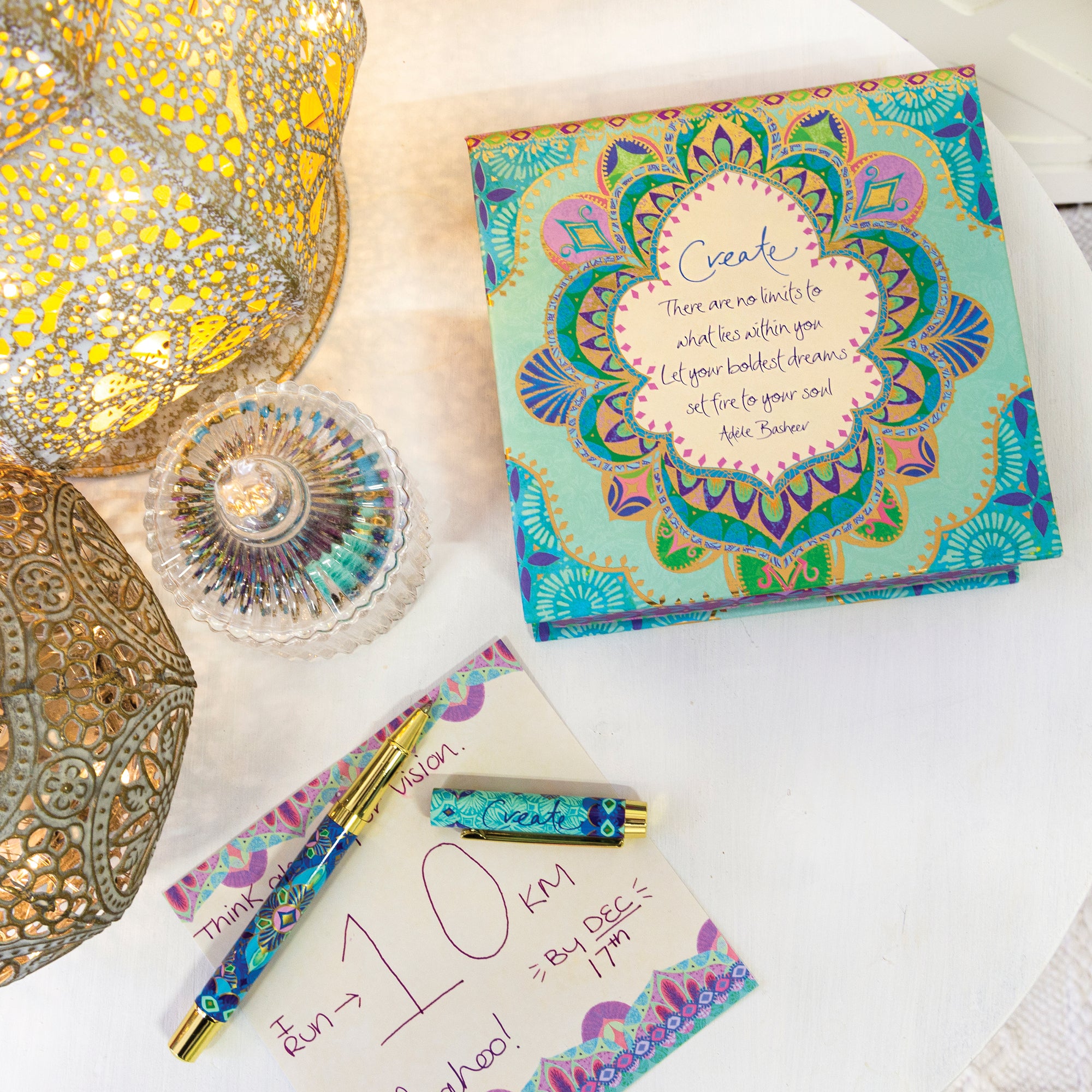 - IN-HOUSE DESIGN: Designed by Adele Basheer, "Create; There Are No Limits To What Lies Within You. Let Your Boldest Dreams Set Fire To Your Soul" text and accompanying design are both printed onto the note box.