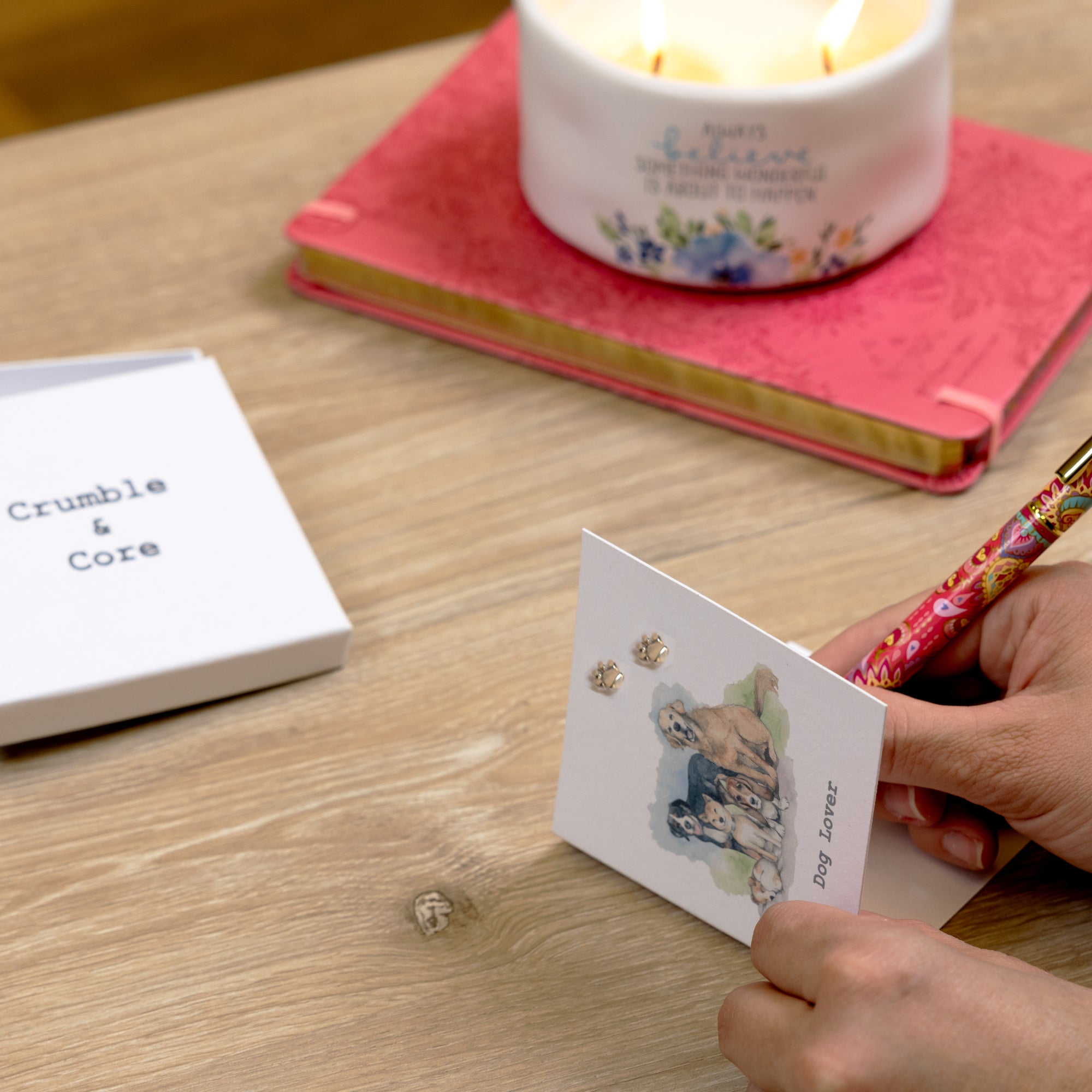 - PREMIUM QUALITY: A 3.25" x 3.25" blank, thick white paper greeting card holds a pair of earrings on its front. The small .24" studs with a paw print and solid sterling silver features a push-back backing. It is packaged inside a plastic polybag, with cotton padding between the card's front and back, neatly tucked inside a white gift box with a logo printed on to the top.