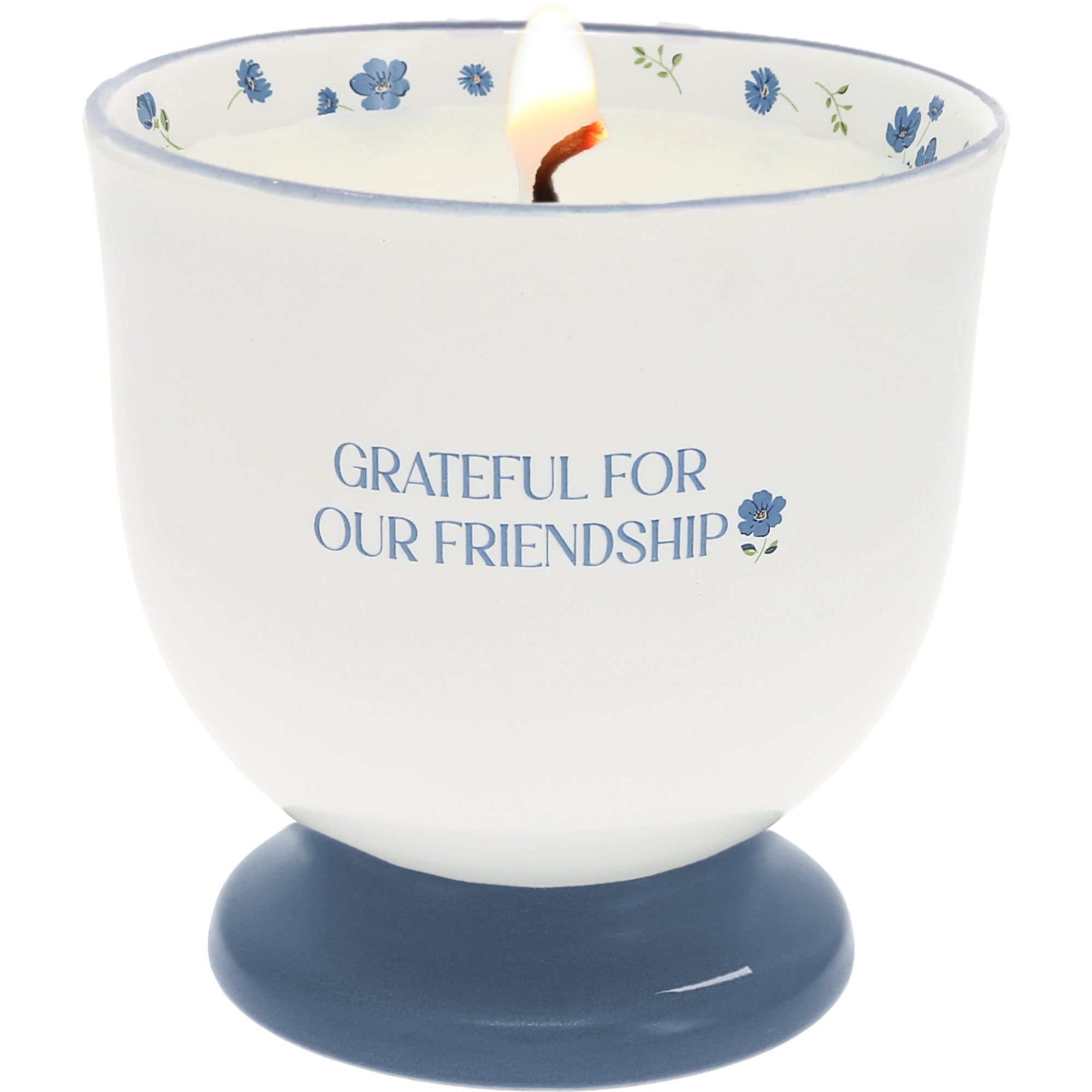 - PREMIUM QUALITY: A beautifully crafted 13 oz candle made from 100% soy wax and housed in a stoneware pedestal vessel with raised artwork reading “Grateful for Our Friendship.” Includes a wax-reveal interior with blue florals that appear as the candle burns.