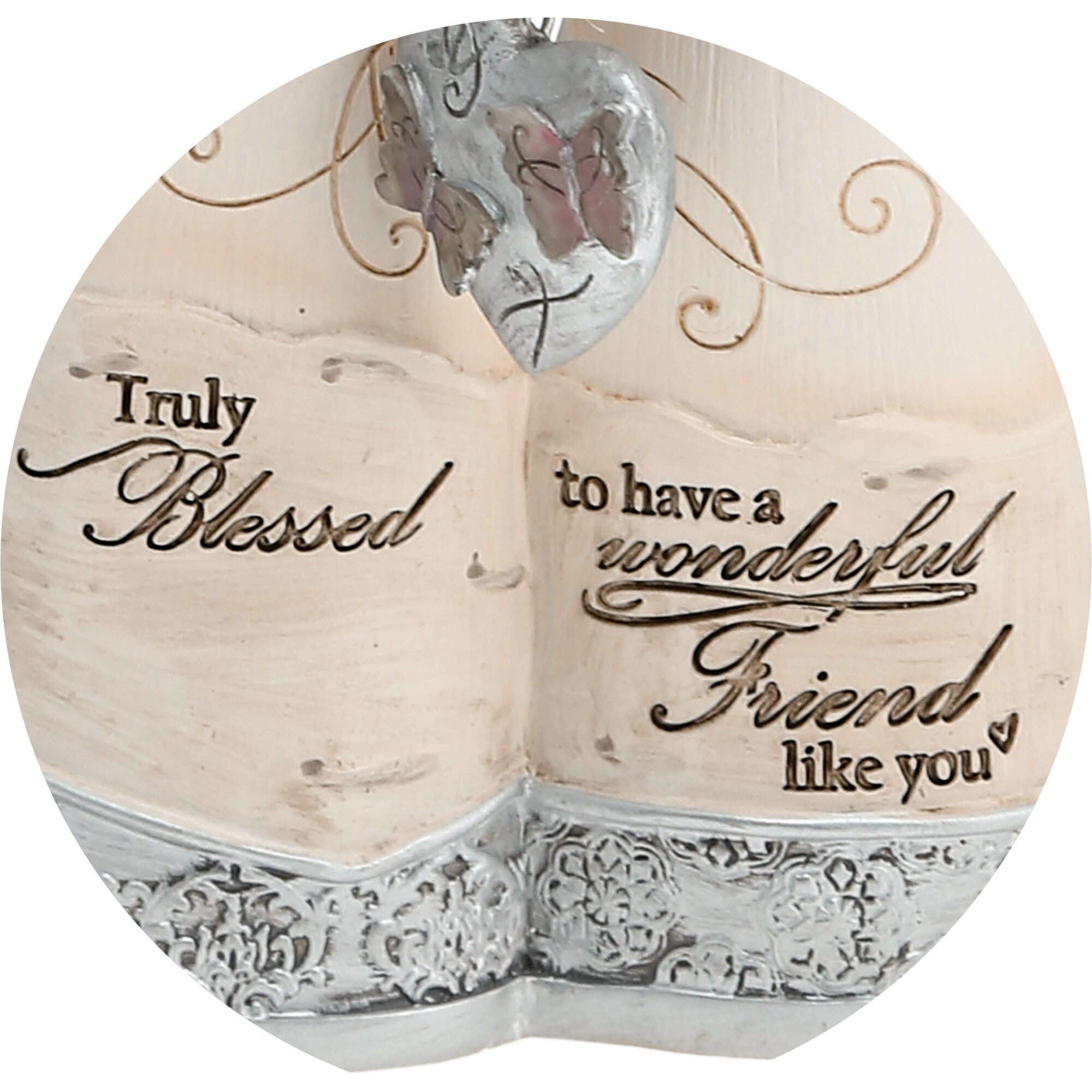 - IN-HOUSE DESIGN: This darling pair of angels makes for the sweetest sentimental piece. "Truly Blessed To Have A Wonderful Friend Like You" text is debossed and painted onto the front of the angel, alongside an intricate silver design and heart. One brown haired angel and one blonde haired angel are jointly holding a heart decorated with pretty pink butterflies. There are foam pads on the bottom to prevent surfaces from being scratched.