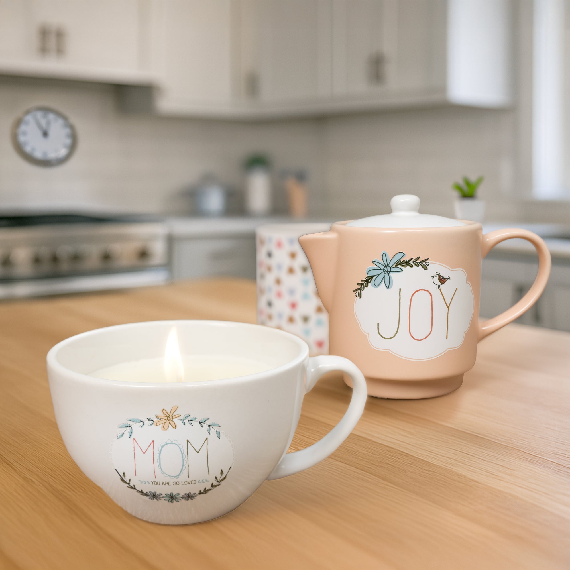 - IN-HOUSE DESIGN: Set in a creamy off-white teacup, the front features the word "MOM" surrounded by botanical elements and the sentiment "You are so loved." The floral design continues onto the candle's surface for a cohesive look.