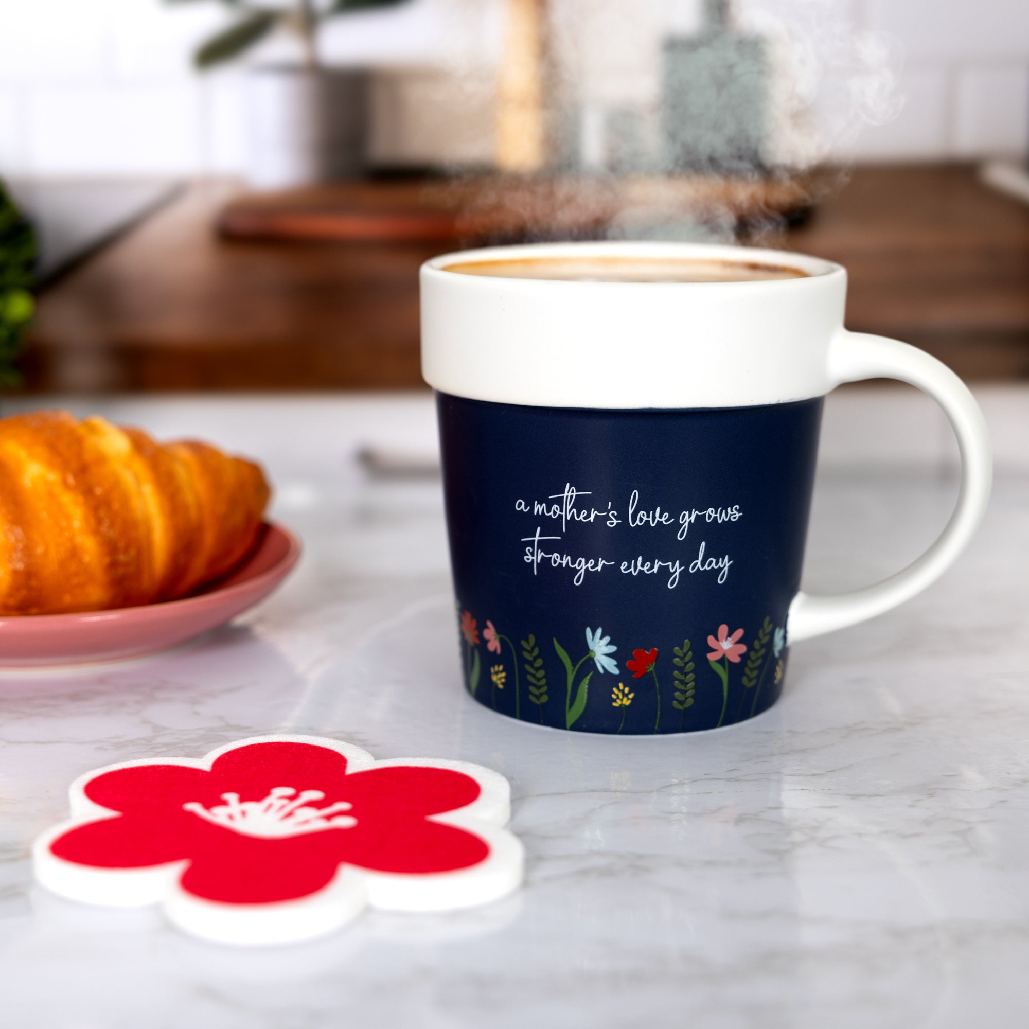- IN-HOUSE DESIGN: The mug features a navy blue floral motif, with the touching phrase "A mother’s love grows stronger every day" in delicate white script. The coaster is shaped like a red flower, symbolizing the everlasting bond between a mother and child.