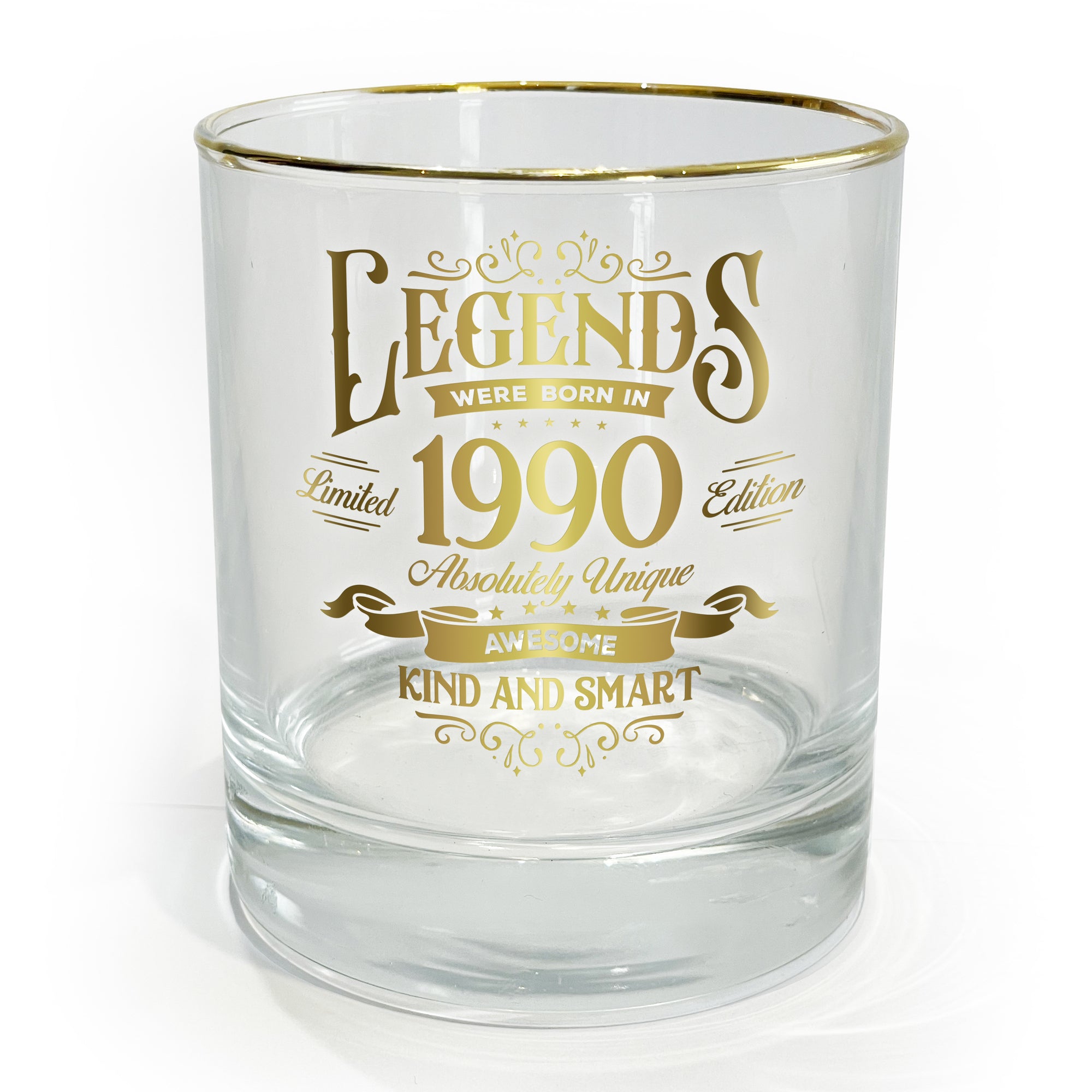 • IN-HOUSE DESIGN: The gold electroplated rim is accompanied by the gold "Legends Were Born In 1990, Limited Edition, Absolutely Unique, Awesome, Kind And Smart" sentiment decal on the front side of the whiskey along with banners and stars.