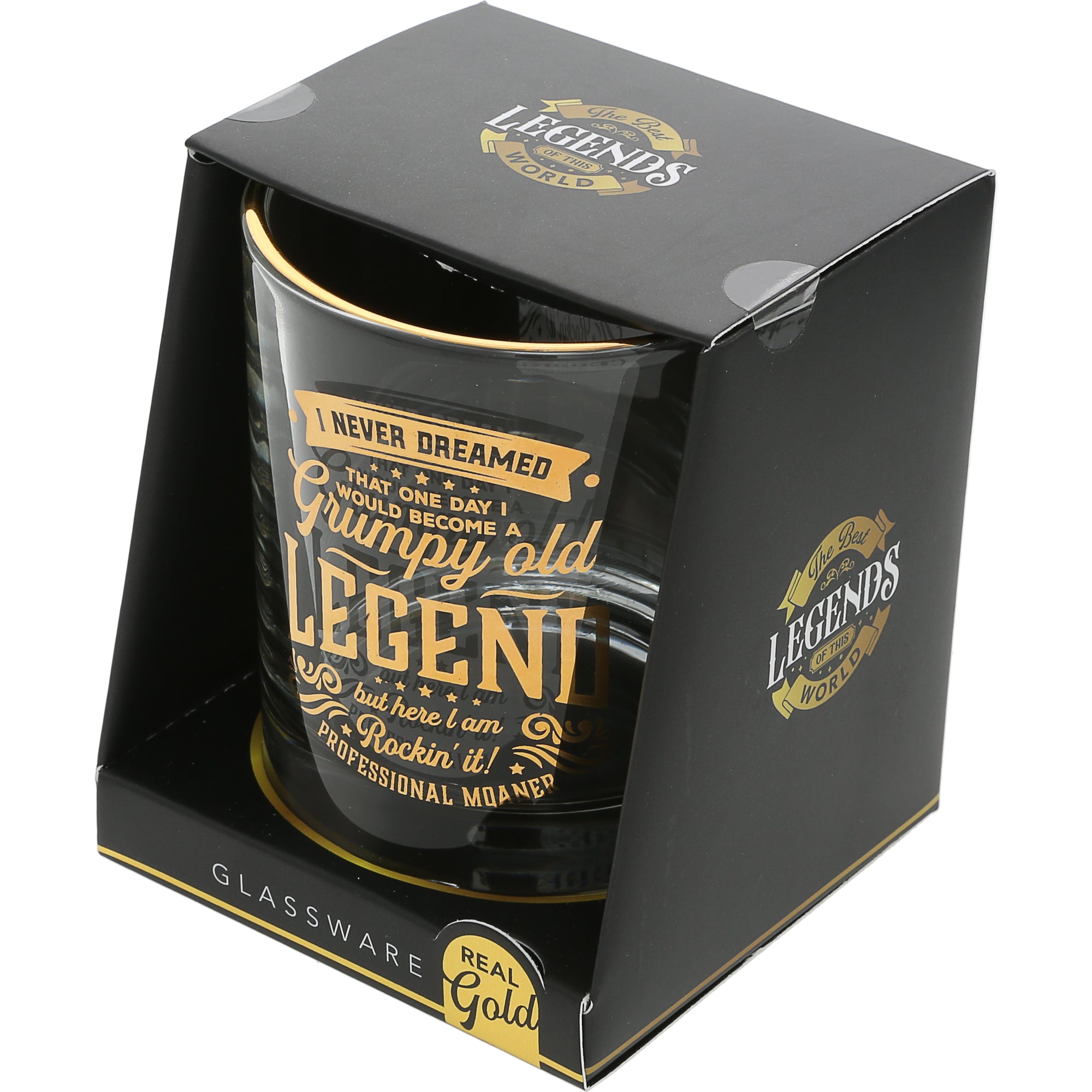 - IN-HOUSE DESIGN: The gold electroplated rim is accompanied by the gold "I Never Dreamed That One Day I Would Become A Grumpy Old Legend, But Here I Am, Rockin' It! Professional Moaner" sentiment decal on the front side of the whiskey along with banners and stars. Glassware with a refined, aesthetically pleasing look.