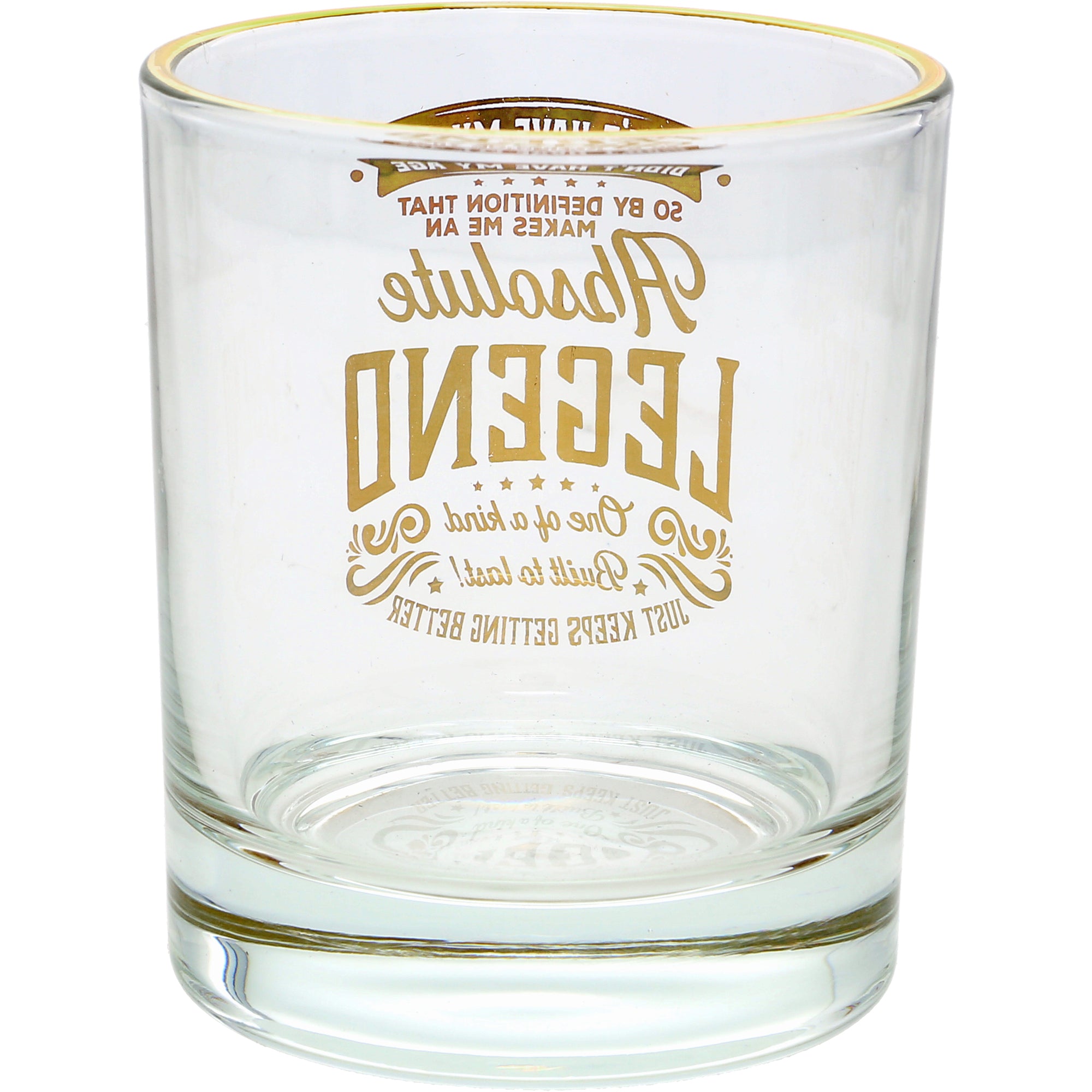 • IN-HOUSE DESIGN: The gold electroplated rim is accompanied by the gold "Didn't Have My Age So By Definition That Makes Me An Absolute Legend One Of A Kind Built To Last! Just Keeps Getting Better" sentiment decal on the front side of the whiskey along with banners and stars. Glassware with a refined, aesthetically pleasing look.