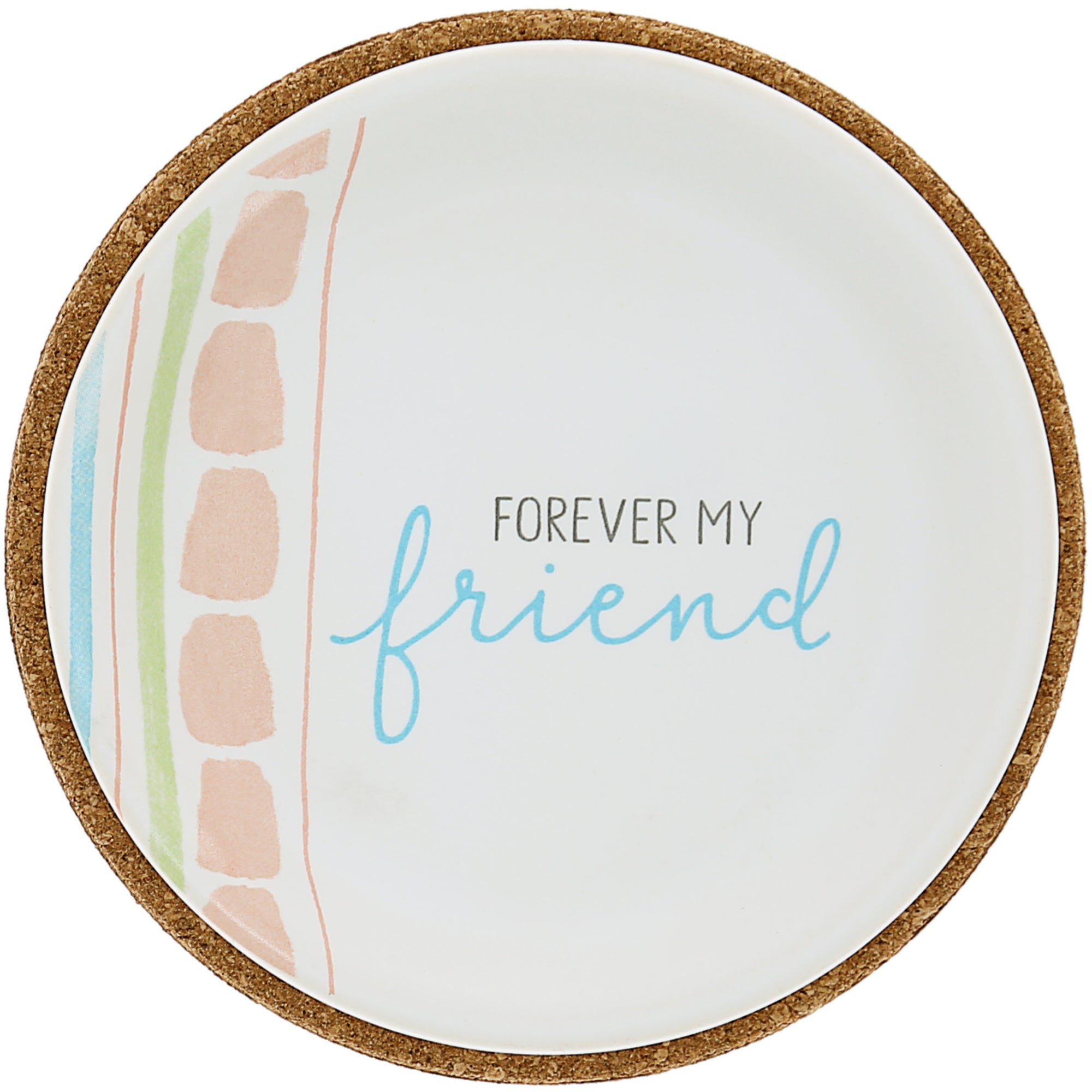 - IN-HOUSE DESIGN: A blue, pink & green vertical striped pattern watercolor paint-inspired is accompanied by a teal & gray "Forever My Friend" glossy sentiment decal on the front side of the matte white dish. Artwork designed by Blue Chair Blessing.