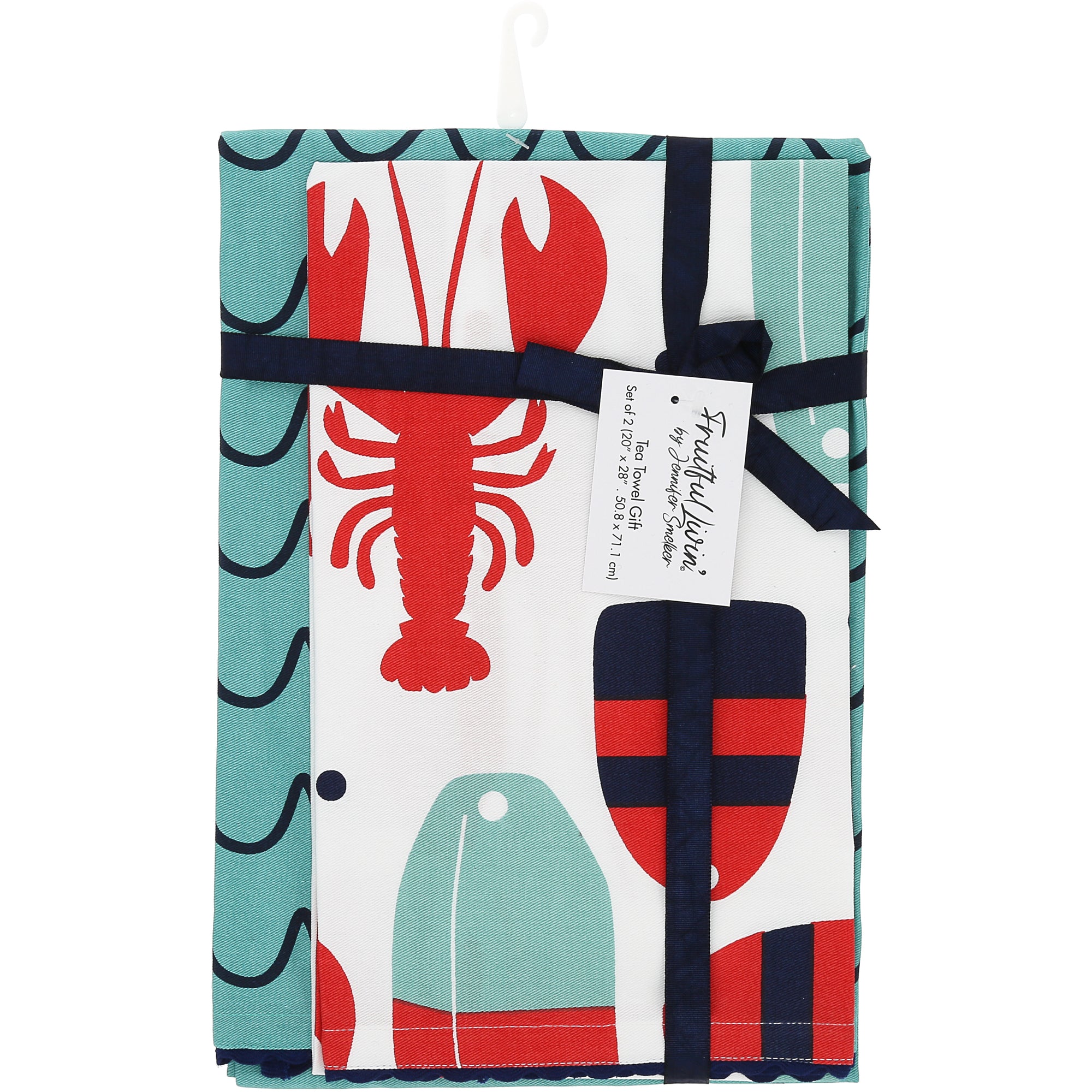 - IN-HOUSE DESIGN: Each towel bears its own design. One with large red lobsters, boat accessories, and navy blue wavy trim on a white background. The second towel features a blue wave pattern on a lighter blue background and navy blue wavy trim.