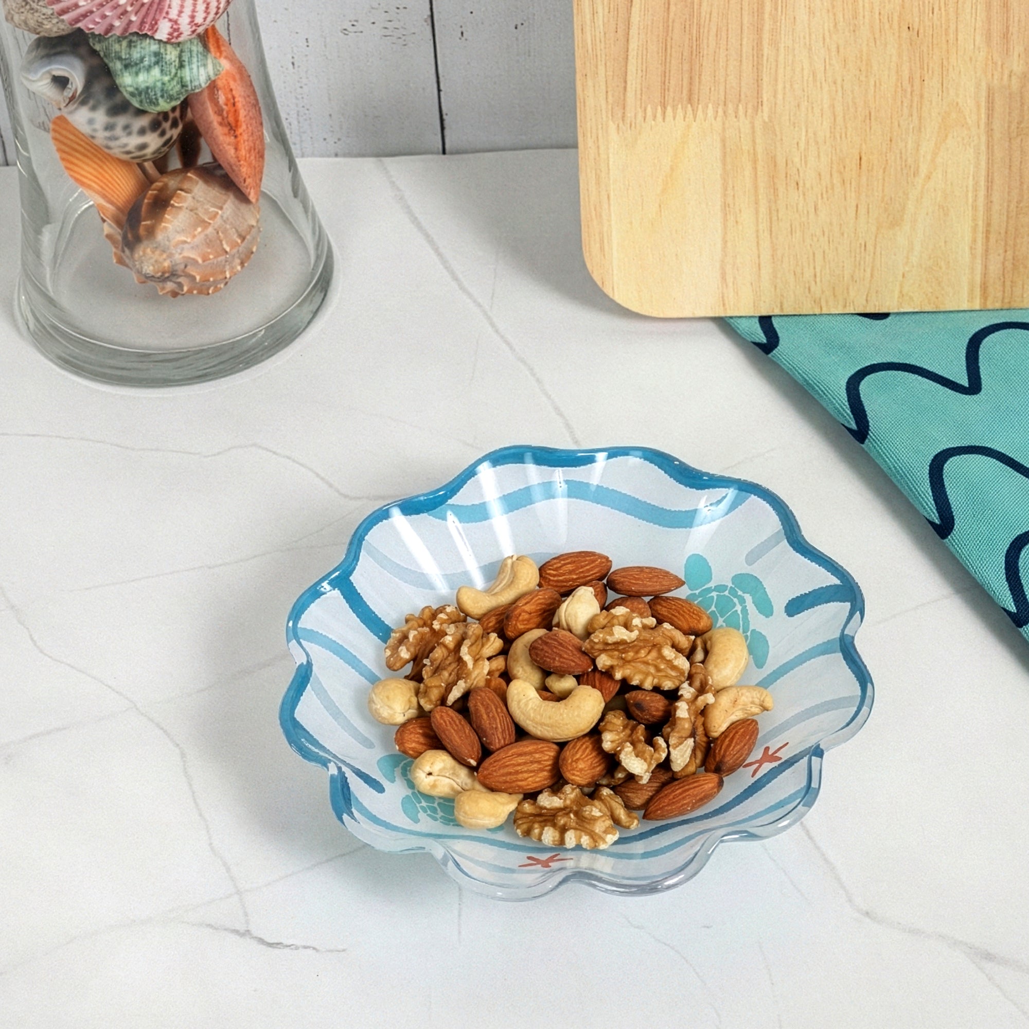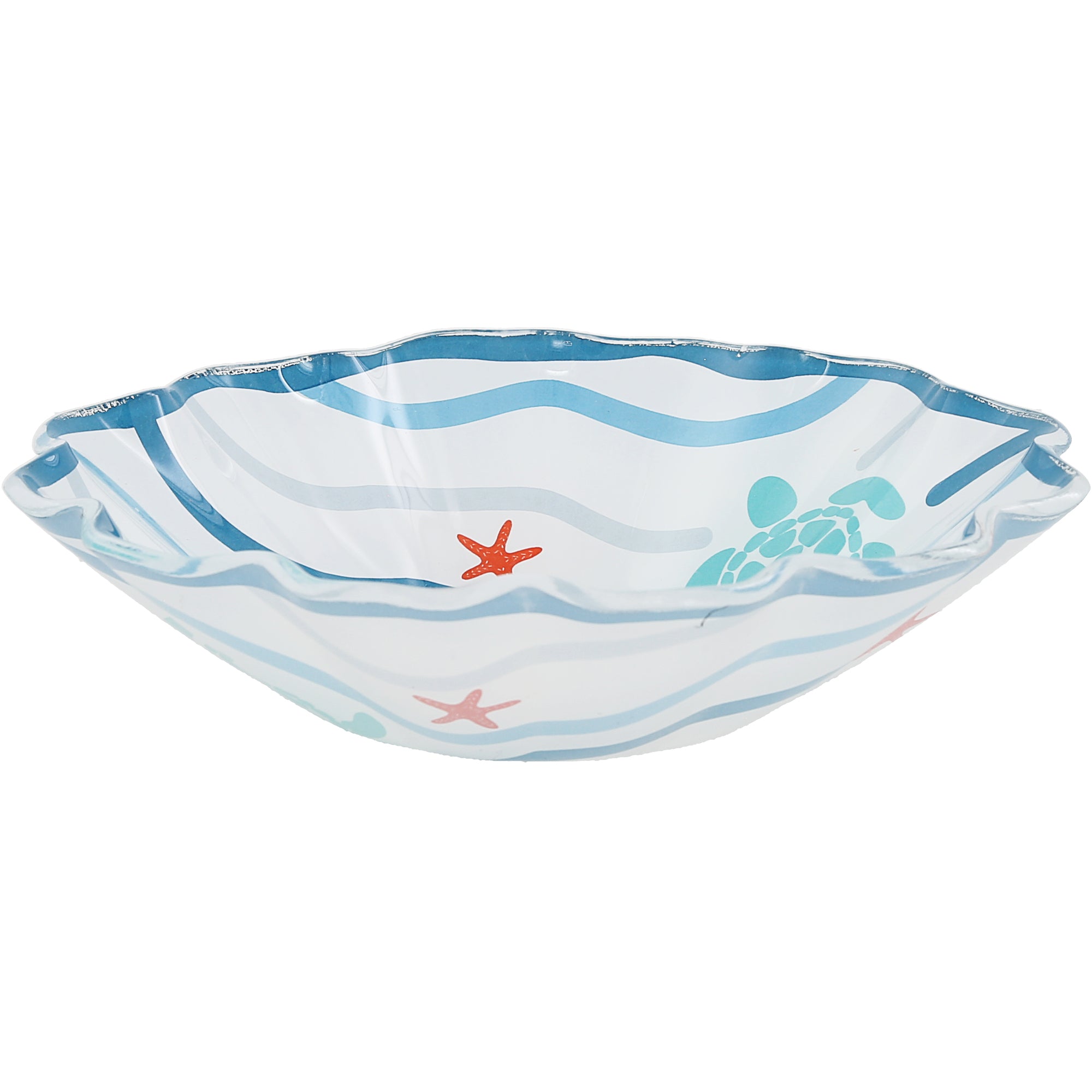 - IN-HOUSE DESIGN: Features original artwork from the Fruitful Livin’ collection by Jennifer Smelker, showcasing sea turtles, starfish, and flowing ocean waves in teal, coral, and aqua tones. The artwork is permanently fused to the underside of the bowl to preserve color vibrancy and prevent surface scratching during use.