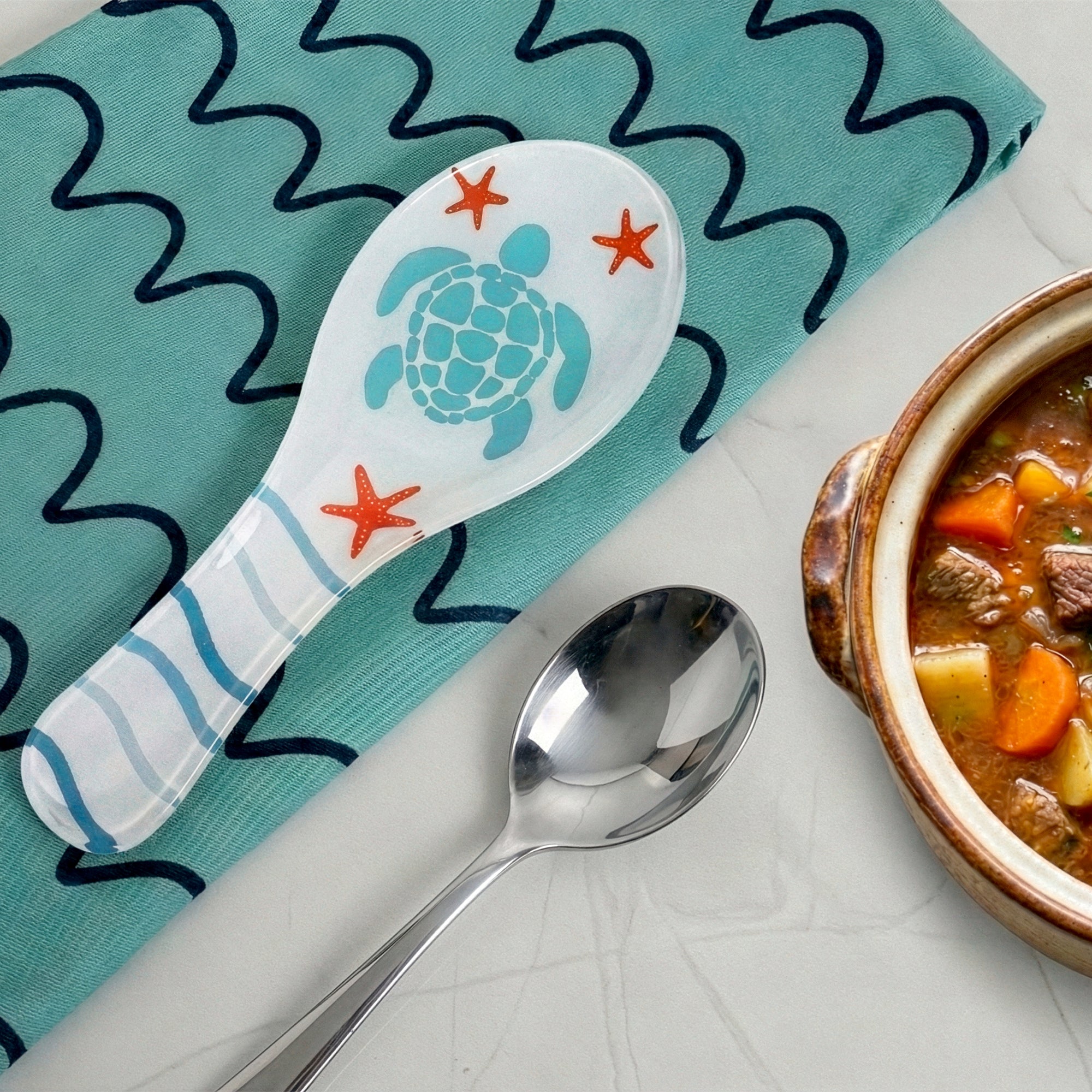 • IN-HOUSE DESIGN: Features exclusive coastal artwork by Jennifer Smelker, including a sea turtle, starfish, and soft ocean waves in teal, coral, and seafoam hues. Printed on the underside of the glass to preserve color vibrancy and prevent scratching during use. A curved resting surface supports spoons, spatulas, and cooking utensils securely.