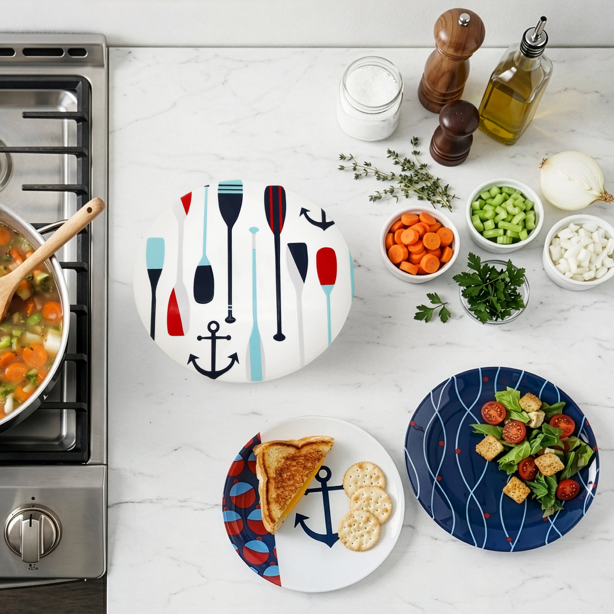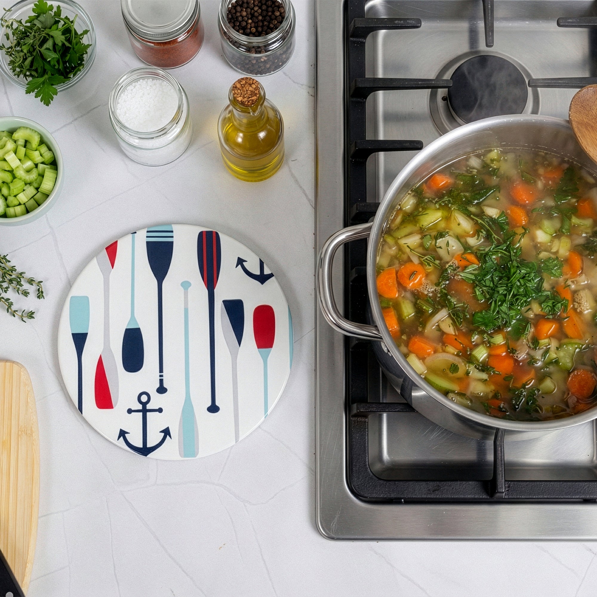 - PREMIUM QUALITY: Crafted from durable ceramic with a cork backing, this round trivet is designed for decorative use and display. The glossy surface features raised decal artwork of colorful paddles and an anchor motif in navy, red, and aqua tones—creating a vibrant lakeside look. The cork bottom adds stability and protection for surfaces. Each trivet is packaged in a sturdy white die-cut box for secure gifting or storage.