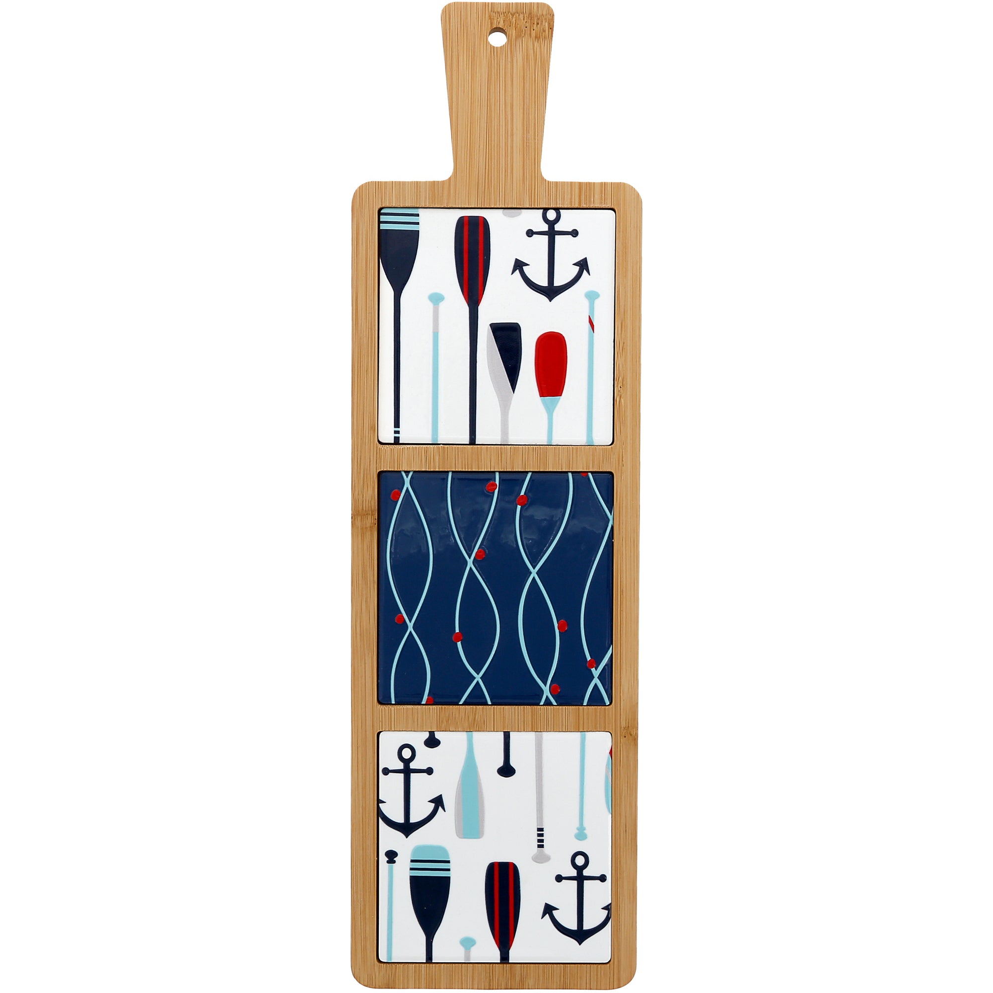 - IN-HOUSE DESIGN: Features a coordinating three-panel lake-themed design with nautical paddles, anchors, oars, and flowing wave patterns in navy, teal, red, and white. Raised decal details add subtle texture and dimension to the artwork. The long vertical layout paired with clean color-block panels creates a modern coastal look perfect for cottages, cabins, and summer homes.