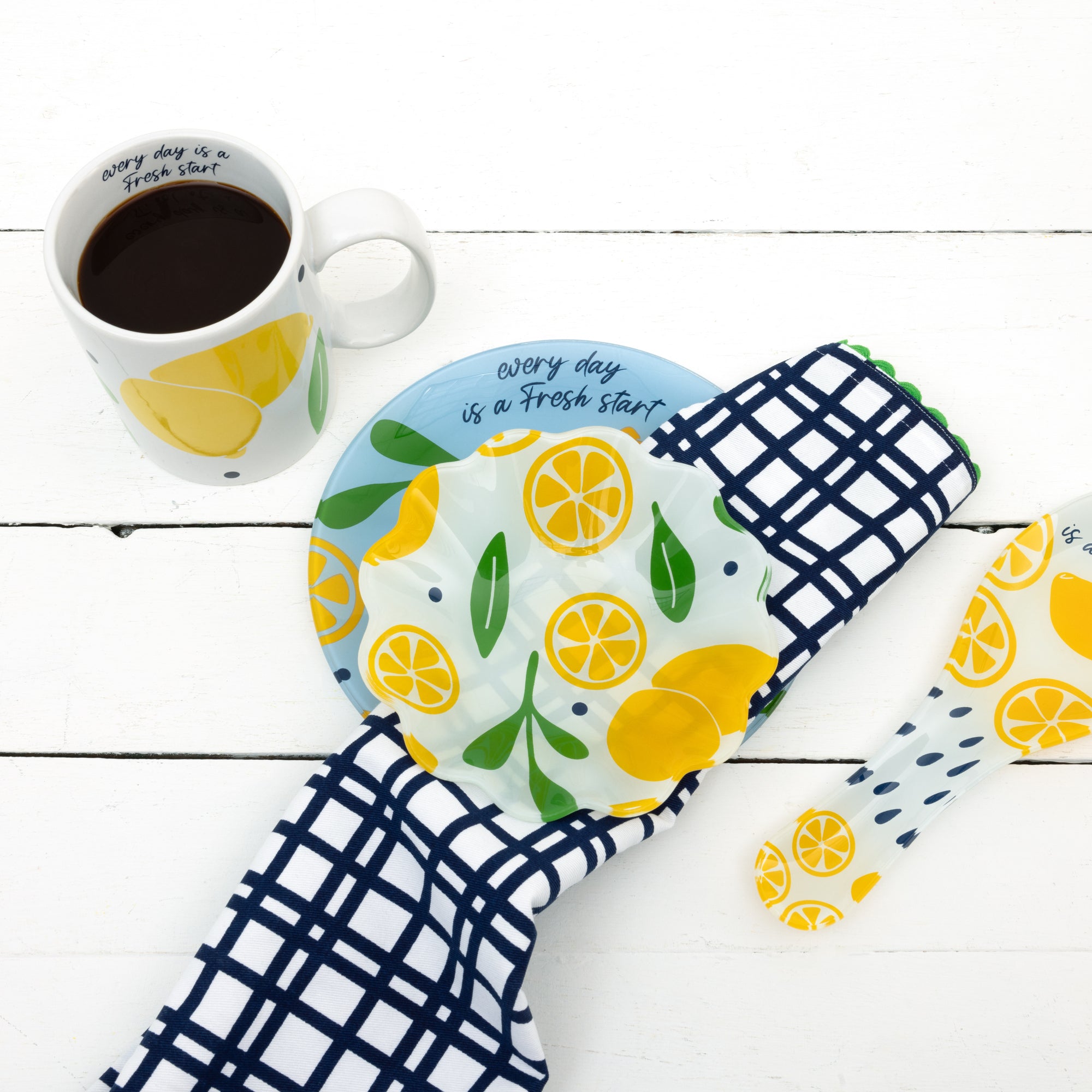 - IN-HOUSE DESIGN: Each towel bears its own design. One with large lemon halves and wholes with green stems, navy blue polka dots, and green wavy trim on a white background. The second towel features navy blue plaid on a white background and green wavy trim.