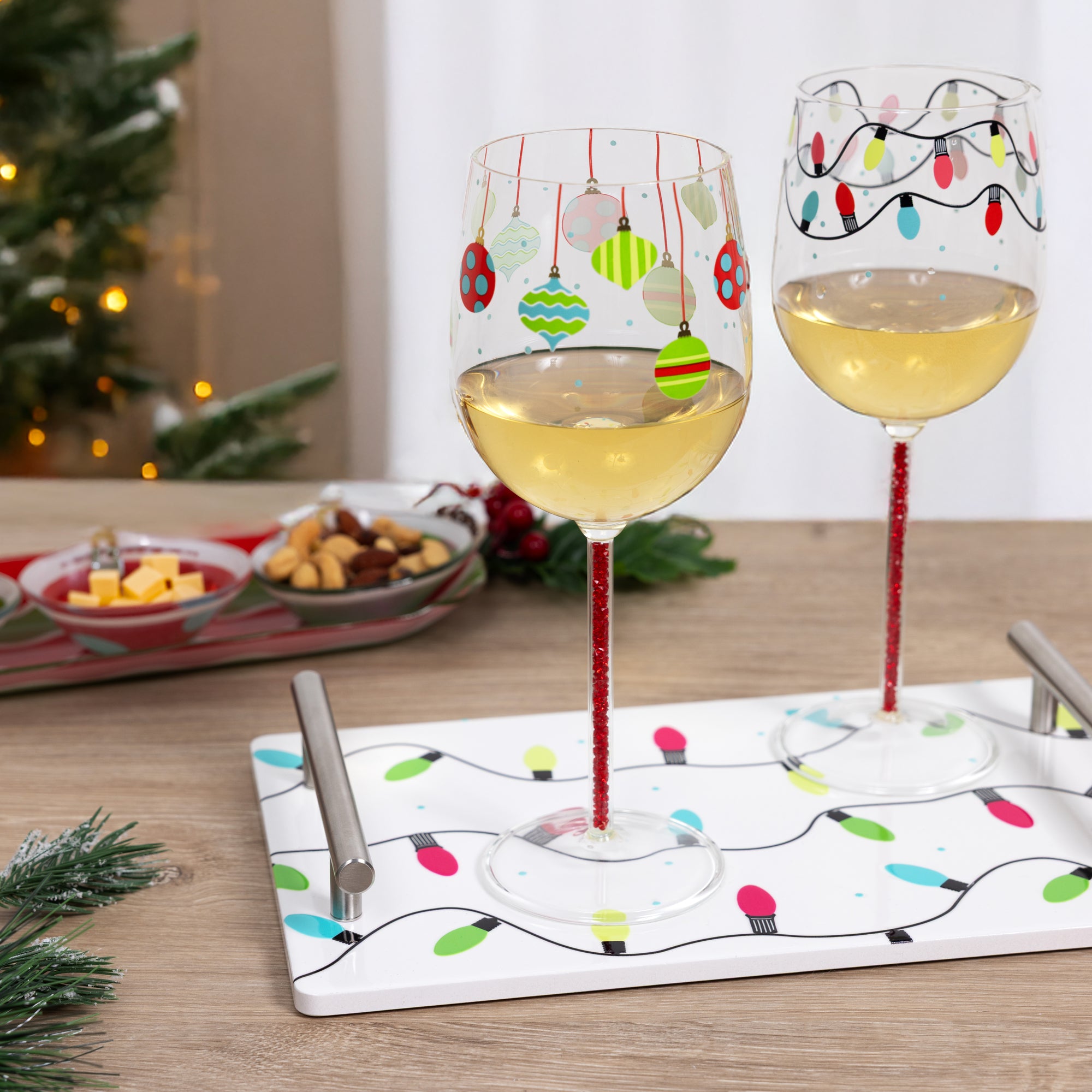 - PREMIUM QUALITY: This 17 oz wine glass includes a full-wrap opaque decal featuring colorful holiday string lights, raised glossy accents, metallic touches, and red gemstones placed inside the stem for an illuminated seasonal effect. Crafted from high-quality glass with a smooth, comfortable rim for joyful holiday sipping. Hand wash only.
